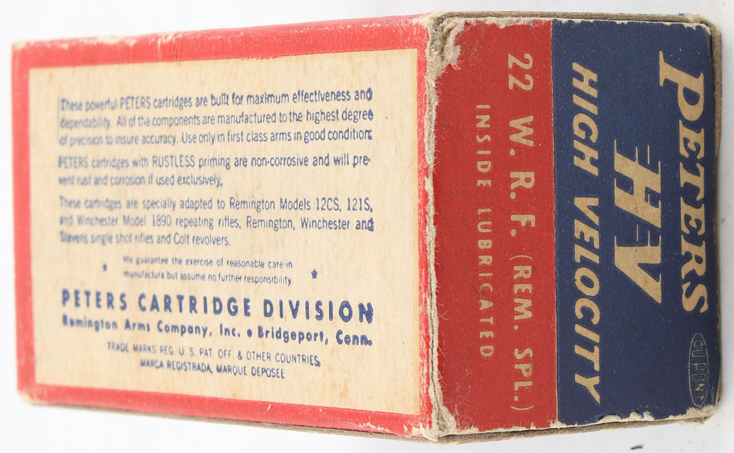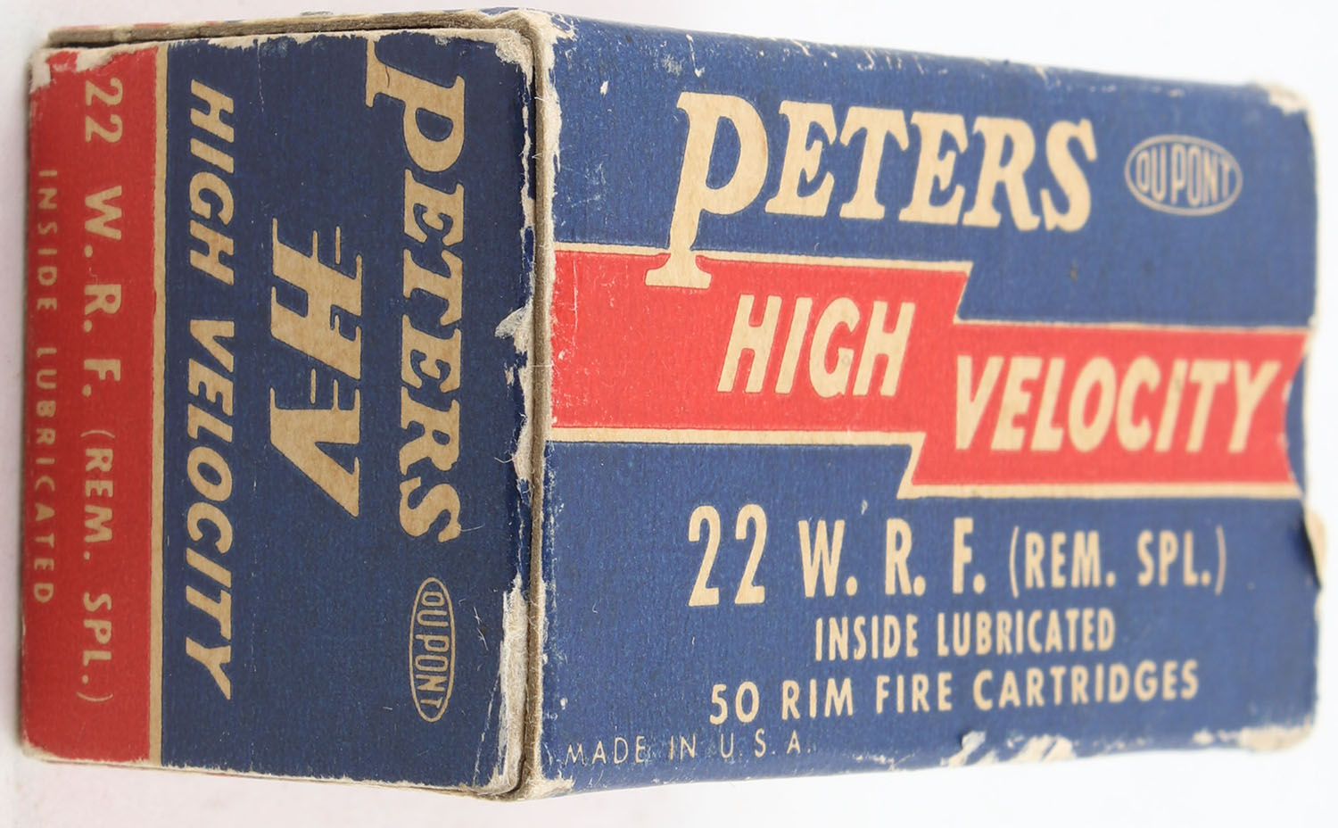 Peters, High Velocity, .22 W.R.F. (Rem. Spl.), RHWeb: PCC-17 WRF-1d, Full, 1pc. Blue red & white box, box is solid with very good to excellent color, minor age soiling, some edge & corner wear, edges are crisp, end flaps are solid, ammo is excellent. Grade: Very Good + - Value: 20 to 30