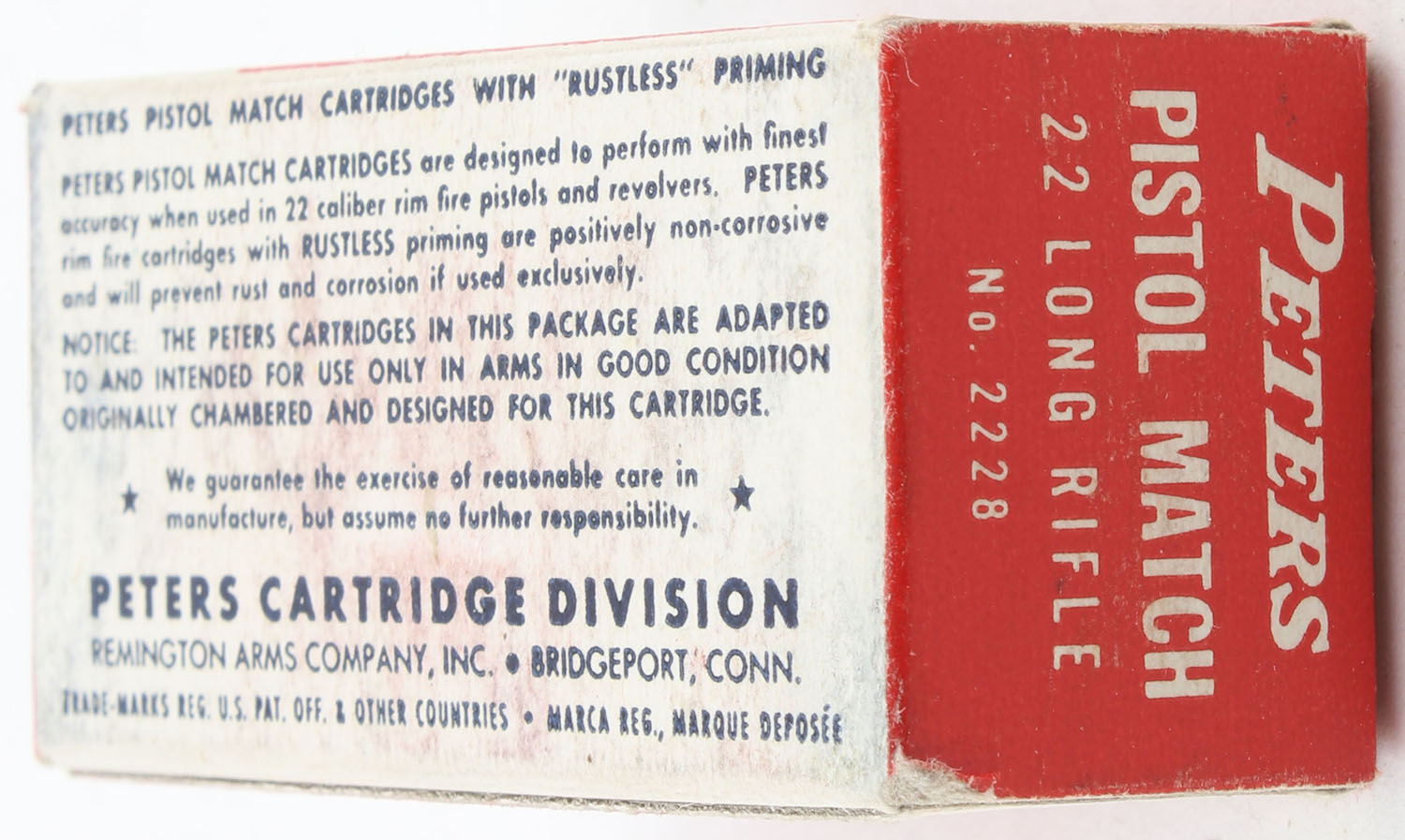Peters, Pistol Match, .22 Long Rifle, RHWeb: PCC-55 LR-3, Full, 1pc. Red white & blue box, box is solid with excellent color, very minor age soiling & corner wear, edges are mostly crisp, end flaps are solid, ammo is excellent to minty. Grade: Excellent - Value: 8 to 12