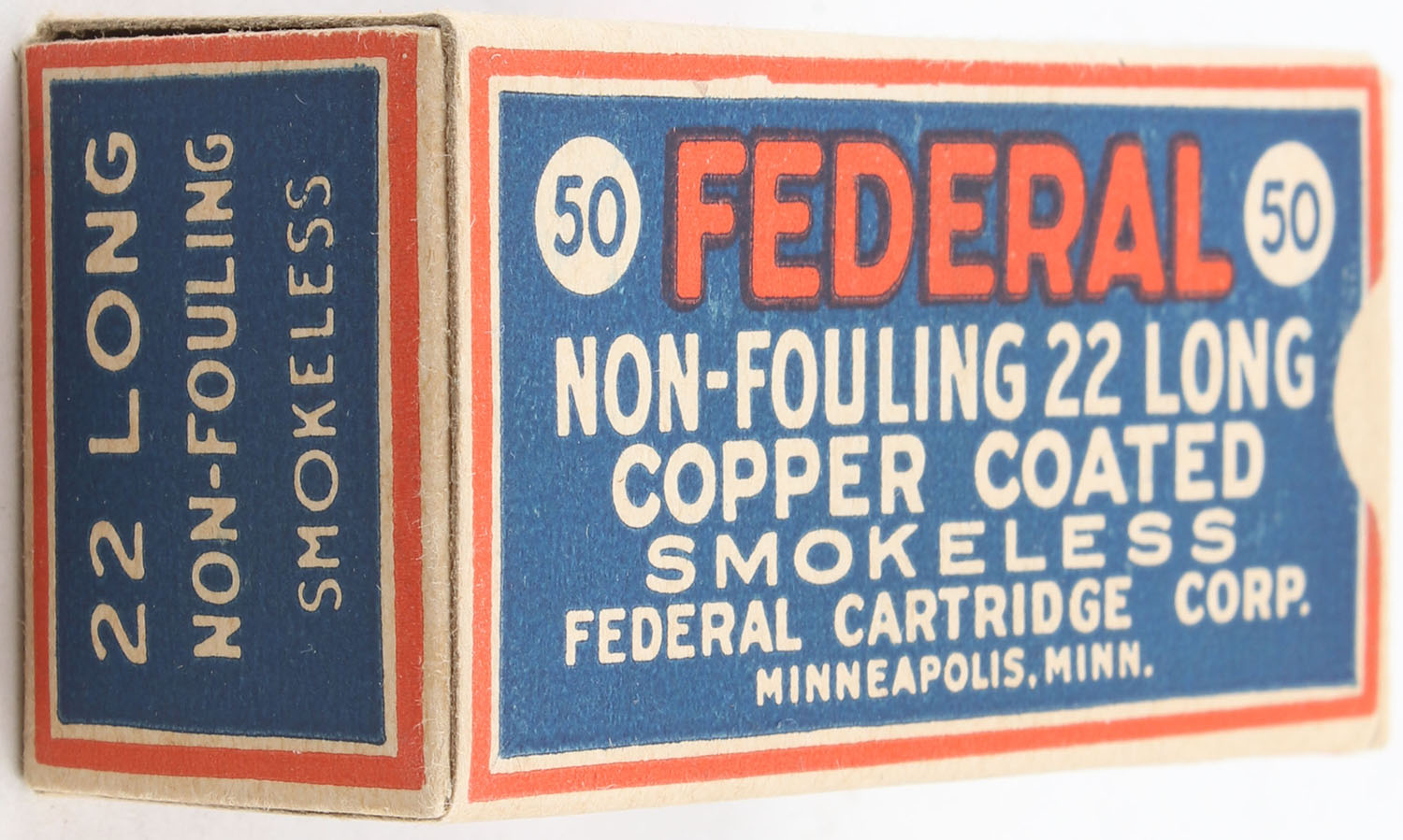 Federal, Non-Fouling Copper Coated, .22 Long, FCC-3 L-2b, Full, 1pc. Blue red & white box, box is near mint with excellent color, only very minor age soiling, corners are mostly sharp, edges are crisp, end flaps are solid, ammo is excellent. Grade: Excellent ++ - Value: 90 to 135