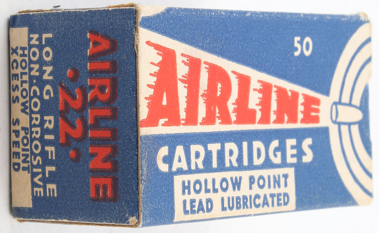 Federal, Airline, .22 Long Rifle Hollow Point, Lead Lubricated, RHWeb: FCC-4.3 LR-10b, Full, 1pc. Blue white & red box, box is solid with excellent to minty color, very minor corner wear, edges are crisp, end flaps are solid, ammo is minty. Grade: Excellent ++ - Value: 30 to 45