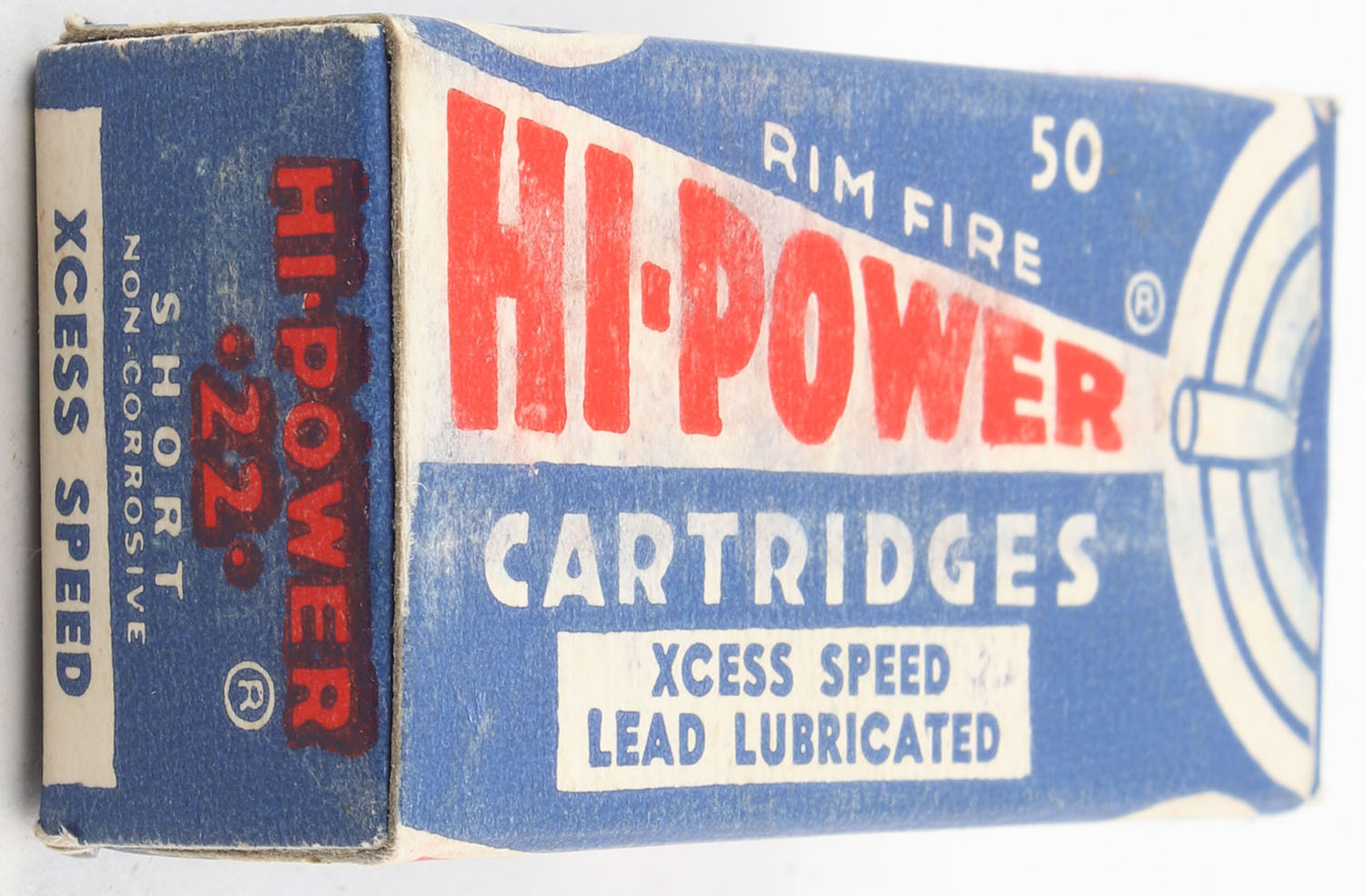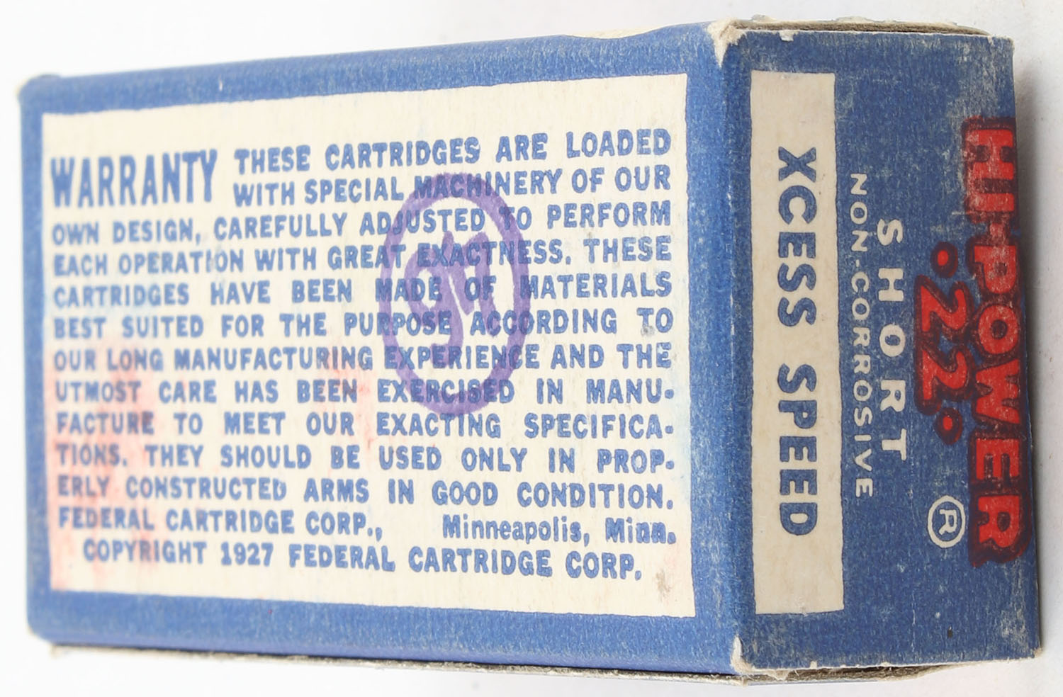 Federal, Hi-Power, .22 Short, Xcess Speed, RHWeb: FED-5 S-1a, Full, 1pc. Blue white & red box, box is solid with very good to excellent color, some shelf wear, very minor corner wear, edges are crisp, end flaps are solid, ammo is excellent. Grade: Excellent - Value: 20 to 30