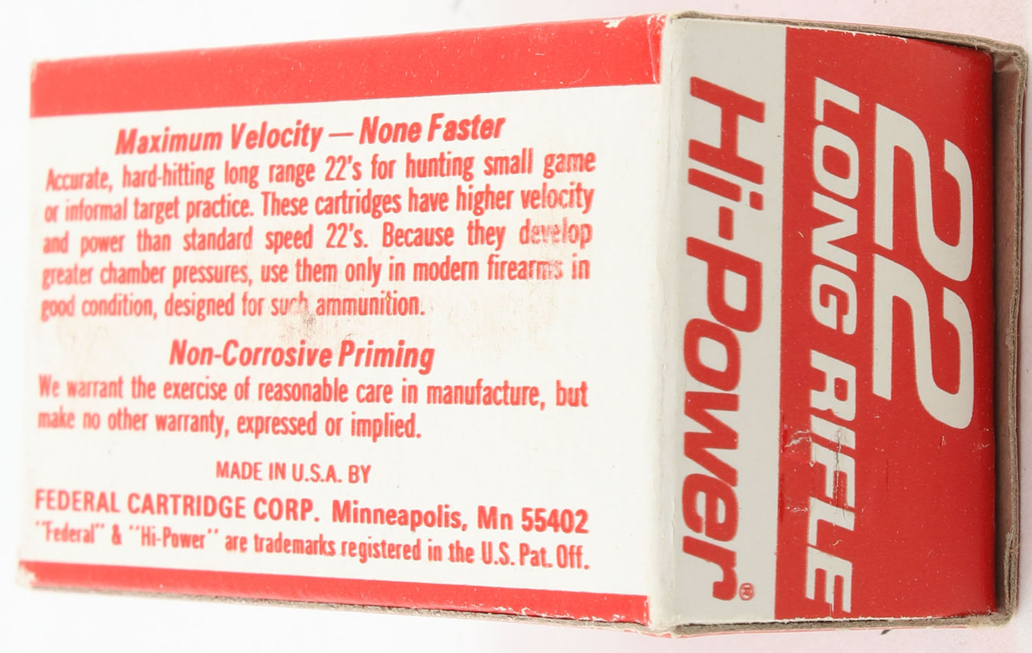 Federal, Hi-Power, .22 Long Rifle, Maximum Velocity, RHWeb: FED-10 LR-2a, Full, 1pc. Red & white box, box is solid with minty color, very minor corner wear, edges are mostly crisp, end flaps are solid, ammo is minty. Grade: Excellent + - Value: 10 to 15