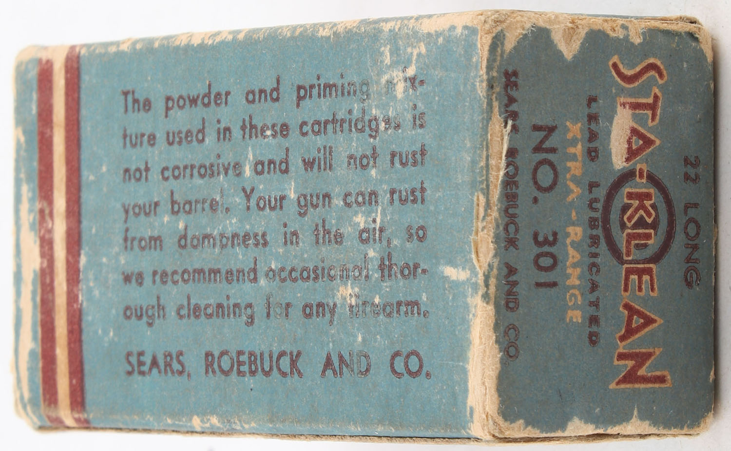 Sears, Sta-Klean, .22 Long, Xtra-Range, RHWeb: SEARS-6 L-1d, Partial 45rds., 1pc. Blue white & maroon box, box is solid with very good color, some age soiling, some edge & corner wear, end flaps are solid, ammo is very good. Grade: Very Good - Value: 6 to 10