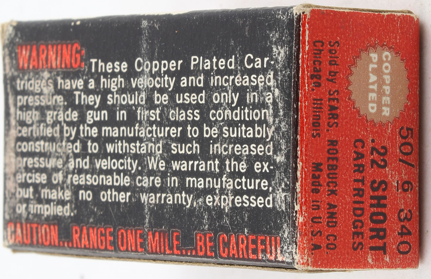Sears, Copper Plated, .22 Short, RHWeb: SEARS-11 S-1b, Full, 1pc. Red & white box, box is solid with good color, age soiling, some shelf wear, very minor corner wear, edges are crisp, end flaps are solid, ammo is minty. Grade: Very Good - Value: 2 to 10