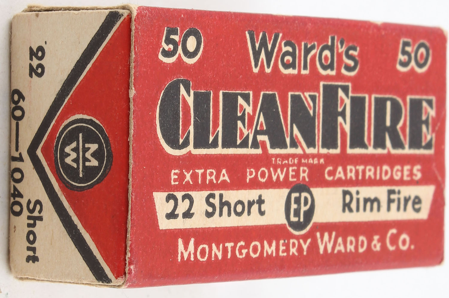 Wards, Cleanfire, .22 Short, Cadmium Plated, RHWeb: MW-3d S-3b1, Full, 1pc. Red white & black box, box is solid with excellent color, very minor corner wear, edges are crisp, end flaps are solid, ammo is excellent to minty. Grade: Excellent ++ - Value: 150 to 225