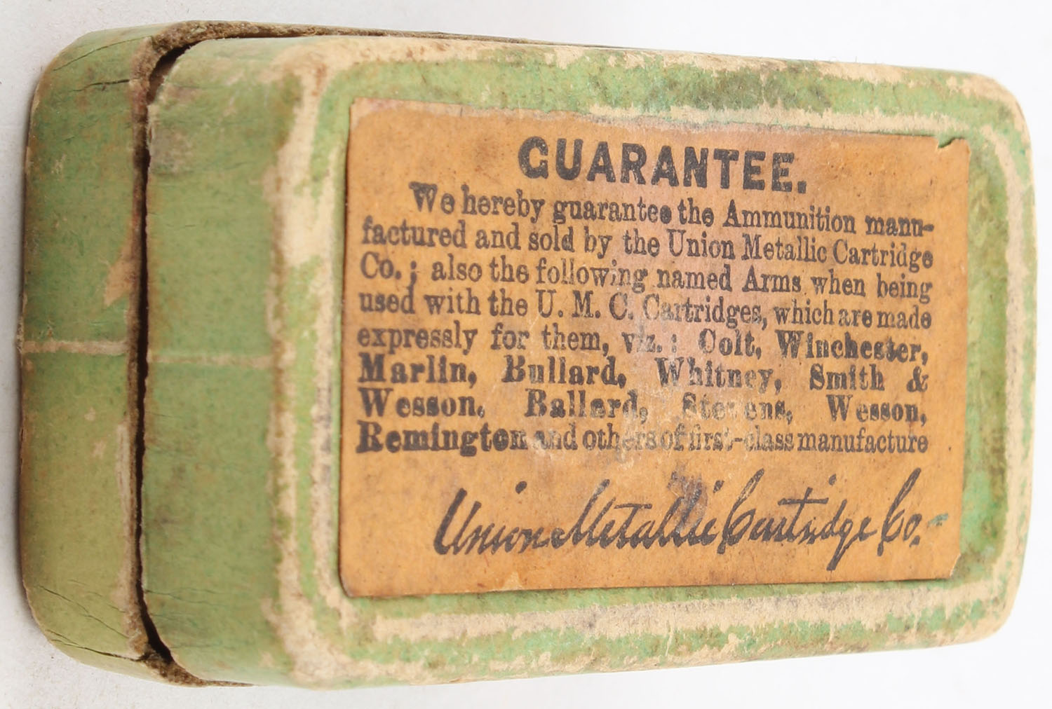 UMC, Rim-Fire Cartridges, .22 Short, Swaged Bullets, RHWeb: UMC-8 S-3(?), Full, 2pc. Green box with red top label, missing side sealing label, box is solid with very good color, minor age soiling, minor edge & corner wear, top label is intact, ammo is very good. Grade: Good ++ - Value: 10 to 15