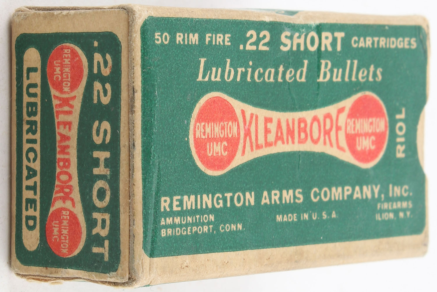 Remington, Kleanbore, .22 Short, RHWeb: REM-7.2 S-1ff, Full, 1pc. Green buff & red dog bone box, box is solid with excellent color, very minor age soiling, minor corner wear, edges are mostly crisp, end flaps are solid, ammo is good to very good. Grade: Excellent - Value: 20 to 30