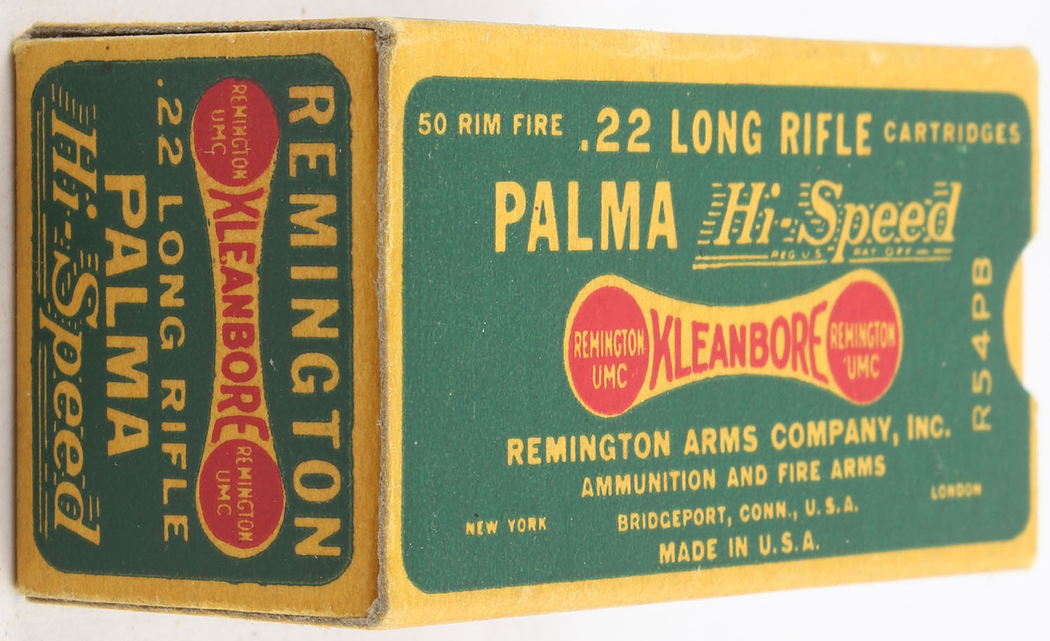 Remington, Kleanbore Palma Hi-Speed, .22 Long Rifle, RHWeb: REM-52 LR-12b, Partial 47rds. 1pc. Green buff & red dog bone box, box is solid with excellent color, corners are mostly sharp, edges are crisp, end flaps are solid, ammo is excellent. Grade: Excellent ++ - Value: 60 to 90