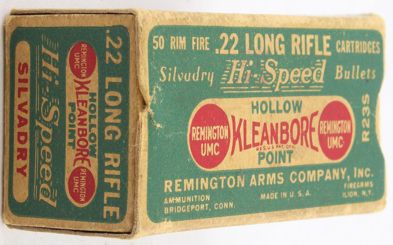 Remington, Kleanbore, Silvadry Hi-Speed, .22 Long Rifle, RHWeb: REM-7.5 LR-3a, Partial 35rds. 1pc. Green buff & red dog bone box, box is solid with very good to excellent color, very minor age soiling, minor edge & corner wear, end flaps are solid, ammo is excellent. Grade: Very Good ++ - Value: 16 to 24