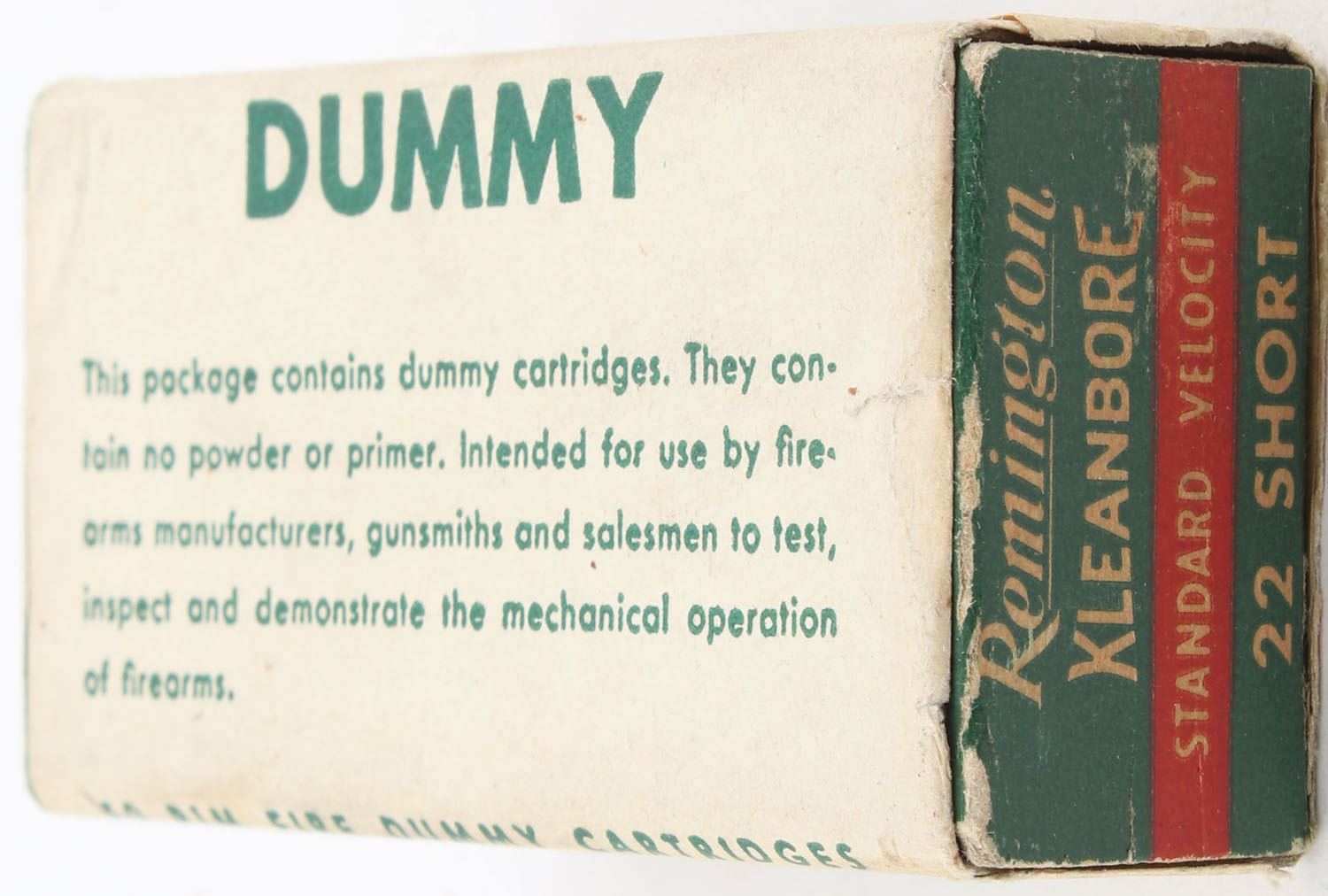 Remington, Kleanbore, .22 Short Dummy, RHWeb: REM-12 S-8 Full, 1pc. Green buff & red box with white & green wraparound label, box is solid with excellent color, very minor age soiling & corner wear, edges are mostly crisp, end flaps are solid, ammo is minty. Grade: Excellent - Value: 24 to 36