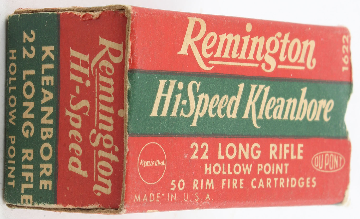 Remington, Hi-Speed Kleanbore, .22 Long Rifle Hollow Point, RHWeb: REM-14 LR-3c, Partial 45rds., 1pc. Red green & buff box, box is solid with excellent color, minor corner wear, edges are mostly crisp, end flaps are solid, ammo is excellent. Grade: Excellent - Value: 4 to 10