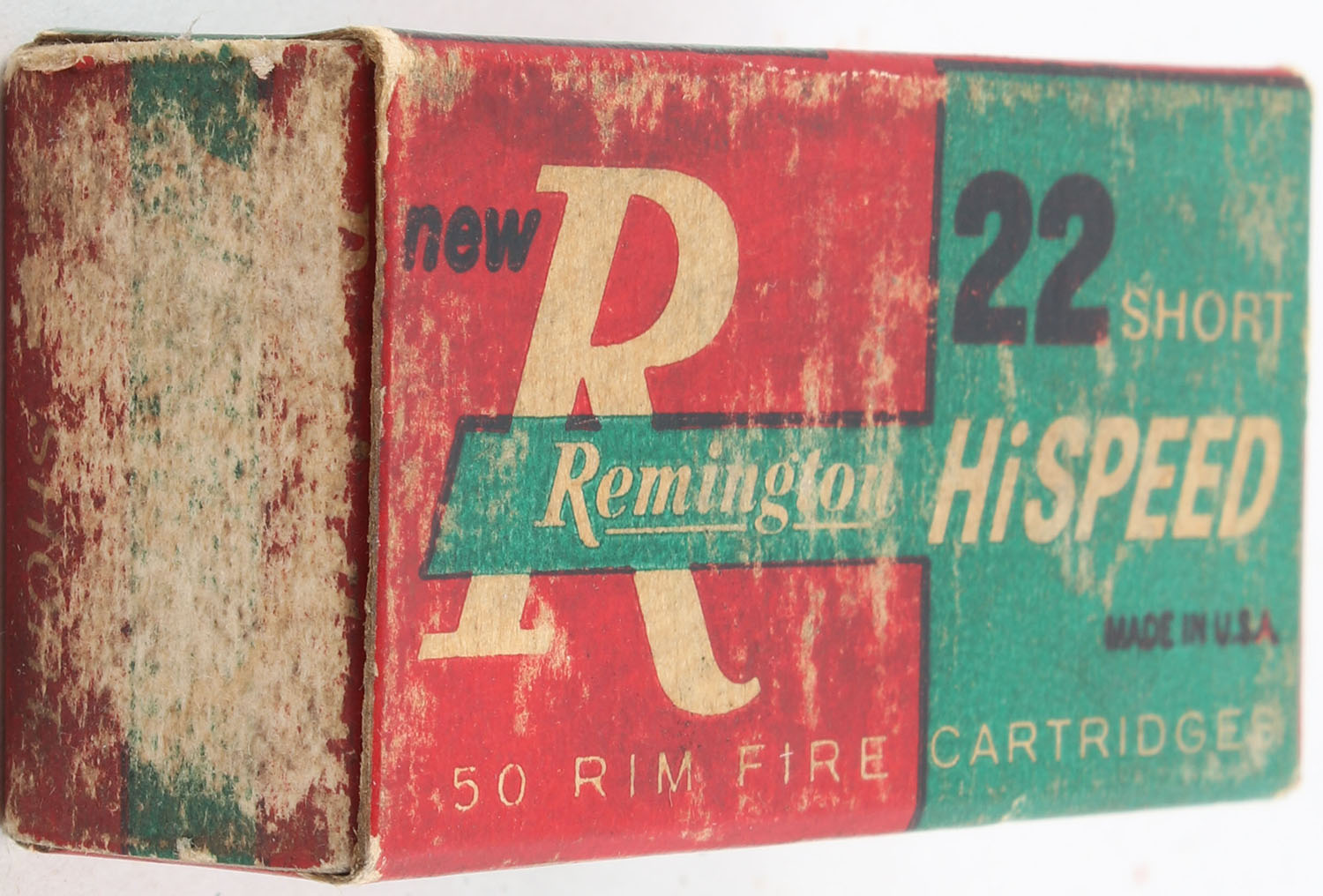 Remington, HiSpeed, .22 Short, RHWeb: REM-15 S-1, Full, 1pc. Red green & white box, box is solid with good color, age soiling & shelf wear, tape residue on left end flap, very minor corner wear, edges are crisp, end flaps are solid, ammo is excellent. Grade: Good ++ - Value: 6 to 10
