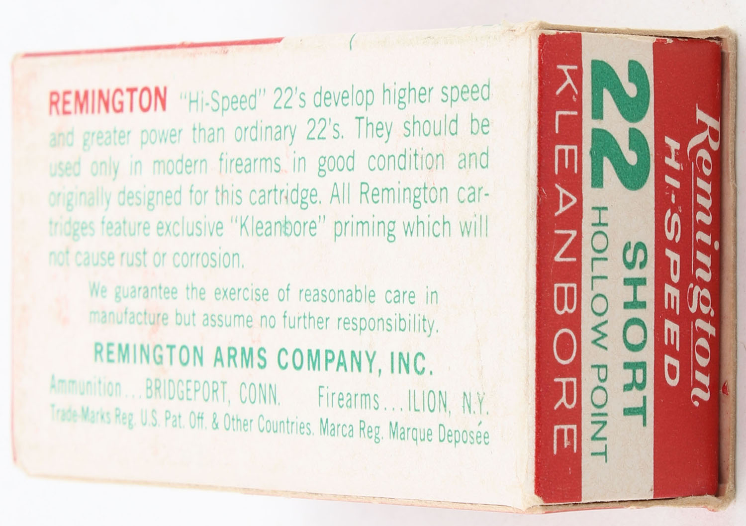 Remington, Hi-Speed, .22 Short Hollow Point, ''Golden'' Bullet, RHWeb: REM-17 S-3b, Full, 1pc. Red white & green box, box is near mint with minty color, only very minor corner wear, edges are crisp, end flaps are solid, ammo is minty. Grade: Excellent ++ - Value: 12 to 18