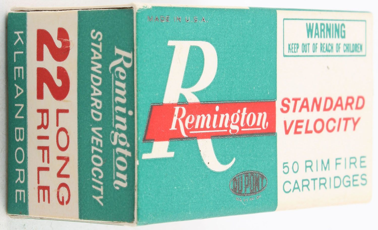 Remington, Standard Velocity, .22 Long Rifle, RHWeb: REM-17 LR-3a, Full, 1pc. Green white & red box, box is near mint with minty color, only very minor corner wear, edges are crisp, end flaps are solid, ammo is excellent. Grade: Excellent ++ - Value: 10 to 15