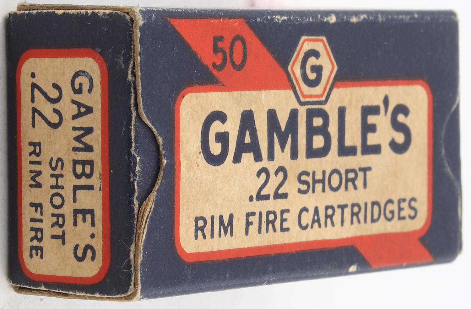 Gambles, Rim Fire Cartridges, .22 Short, RHWeb: GS-1 S-3, Partial 49rds., 1pc. Blue white & red box, box is solid with very good color, minor age soiling, very minor corner wear, edges are mostly crisp, end flaps are solid, ammo is excellent to minty. Grade: Excellent - Value: 150 to 225