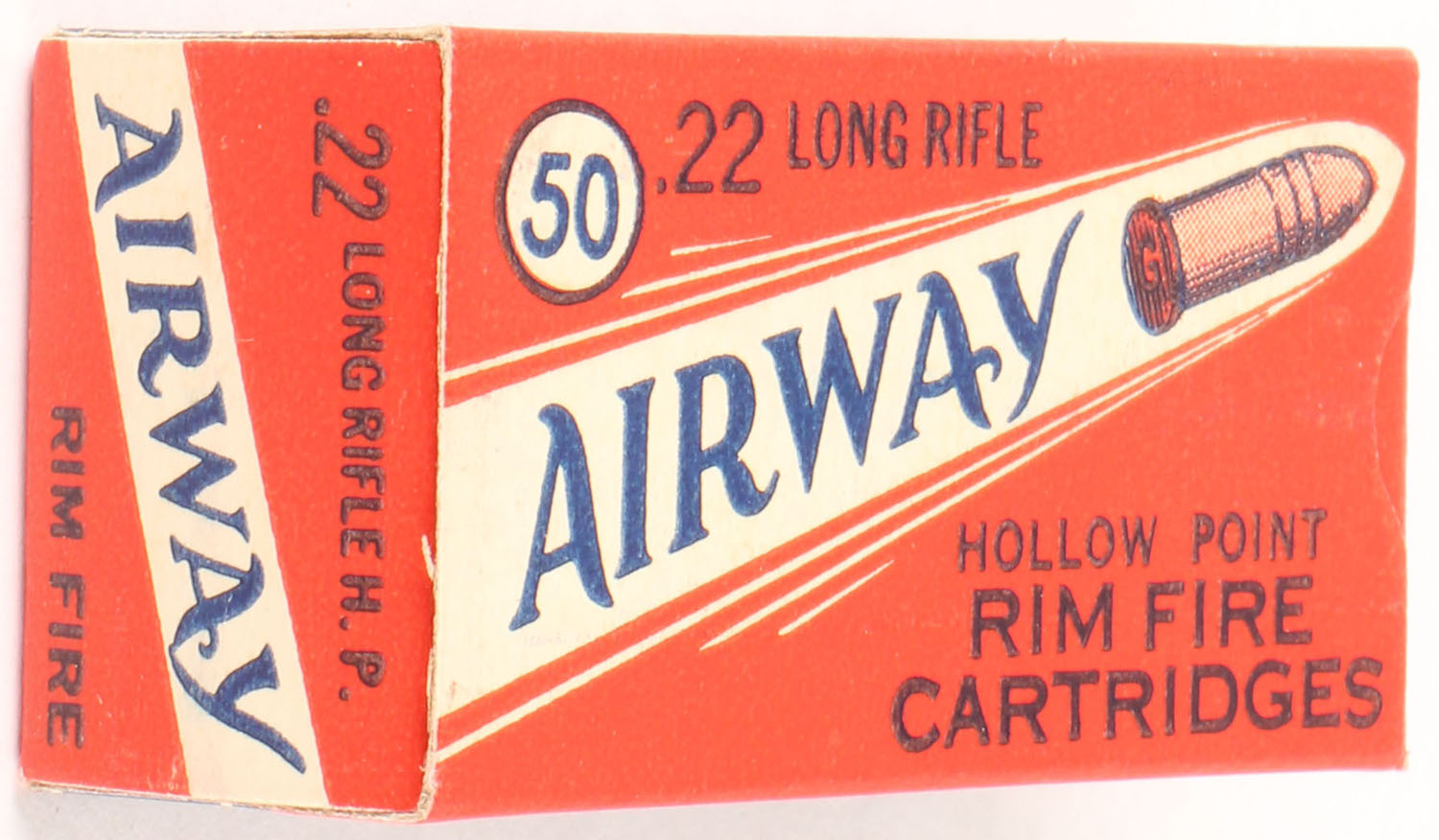Gambles, Airway, .22 Long Rifle Hollow Point, RHWeb: GS-1 LR-2a, Full, 1pc. Red blue & white box, box is MINT with minty color, corners are sharp, edges are crisp, end flaps are solid, ammo is minty. Grade: MINT - Value: 30 to 45
