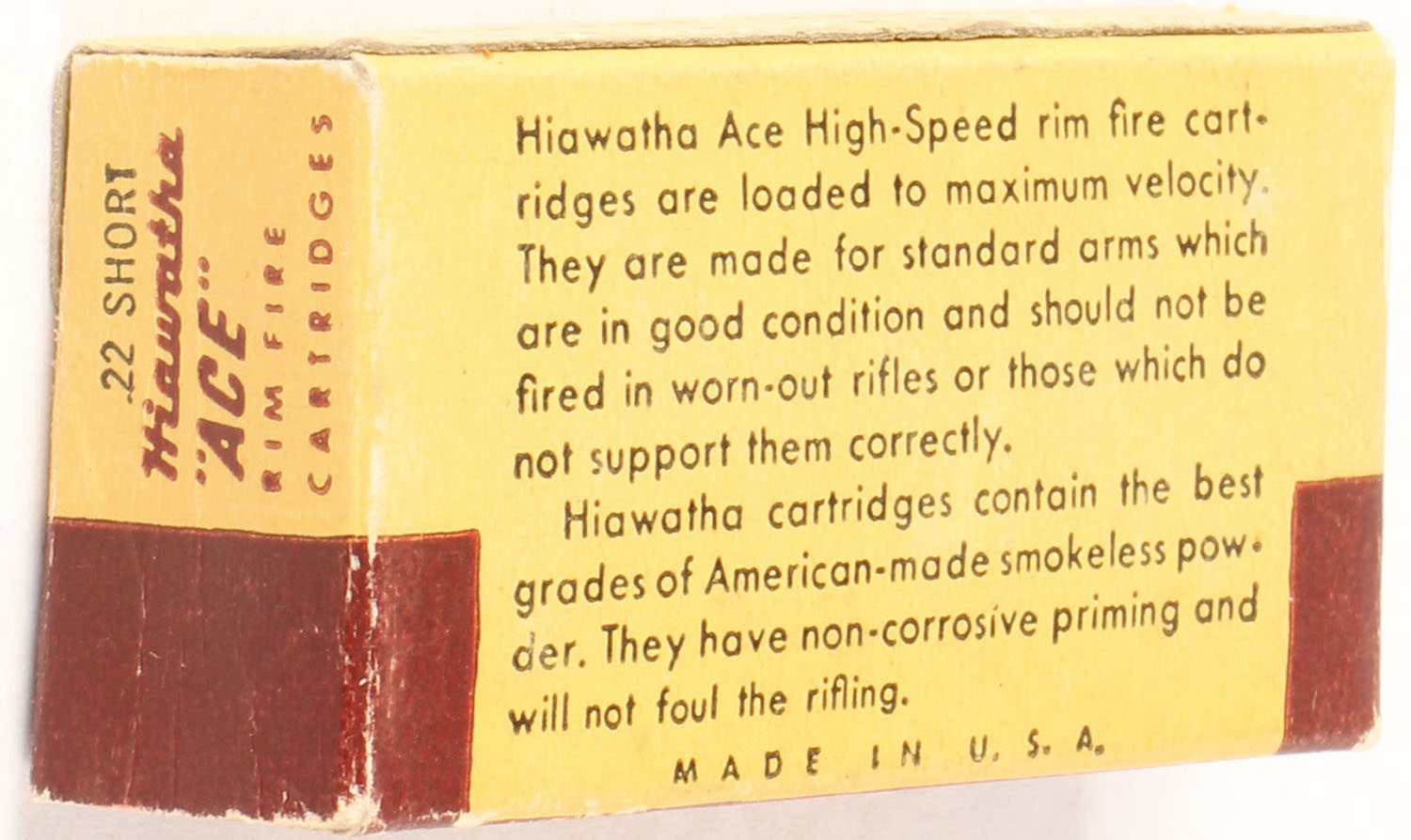 Gambles, Hiawatha ''Ace'', .22 Short, High-Speed, RHWeb: GS-2 S-1, Partial 44rds. 1pc. Yellow & brown box, box is solid with excellent color, very minor corner wear, edges are crisp, end flaps are solid, ammo is excellent. Grade: Excellent - Value: 10 to 15