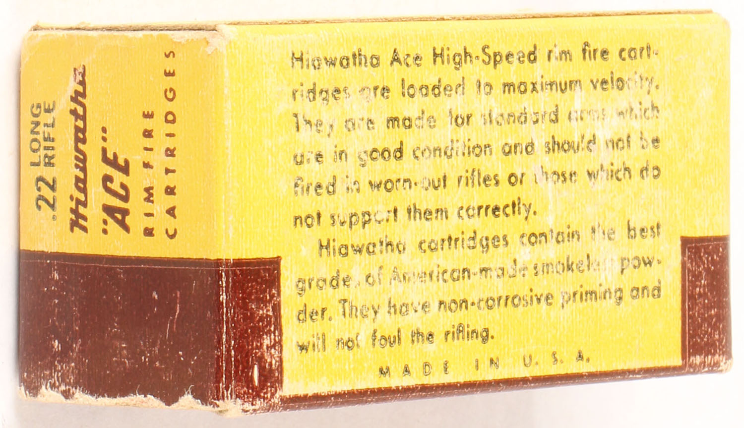 Gambles, Hiawatha ''Ace'', .22 Long Rifle, RHWeb: GS-3 LR-1, Full, 1pc. Yellow & brown box with white child warning label, box is solid with very good color, minor age soiling & corner wear, very minor shelf & edge wear, end flaps are solid, ammo is excellent. Grade: Very Good ++ - Value: 8 to 12