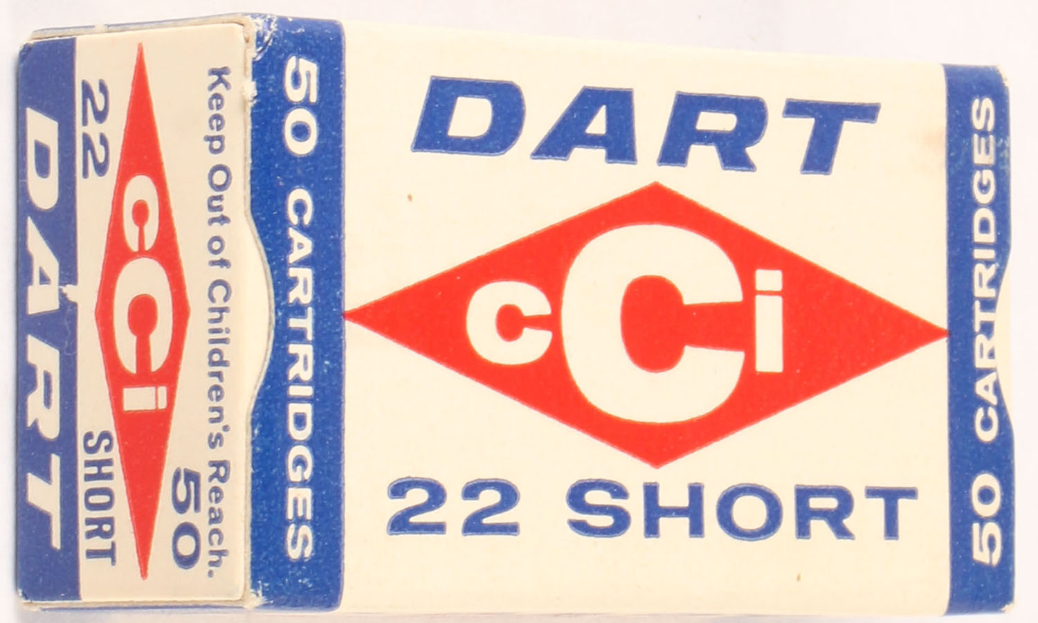 CCi, Dart, .22 Short, RHWeb: CCI-1 S-1a, Full, 1pc. White red & blue box, box is near mint with minty color, only very minor corner wear, edges are crisp, end flaps are solid, ammo is minty. Grade: Excellent ++ - Value: 12 to 18