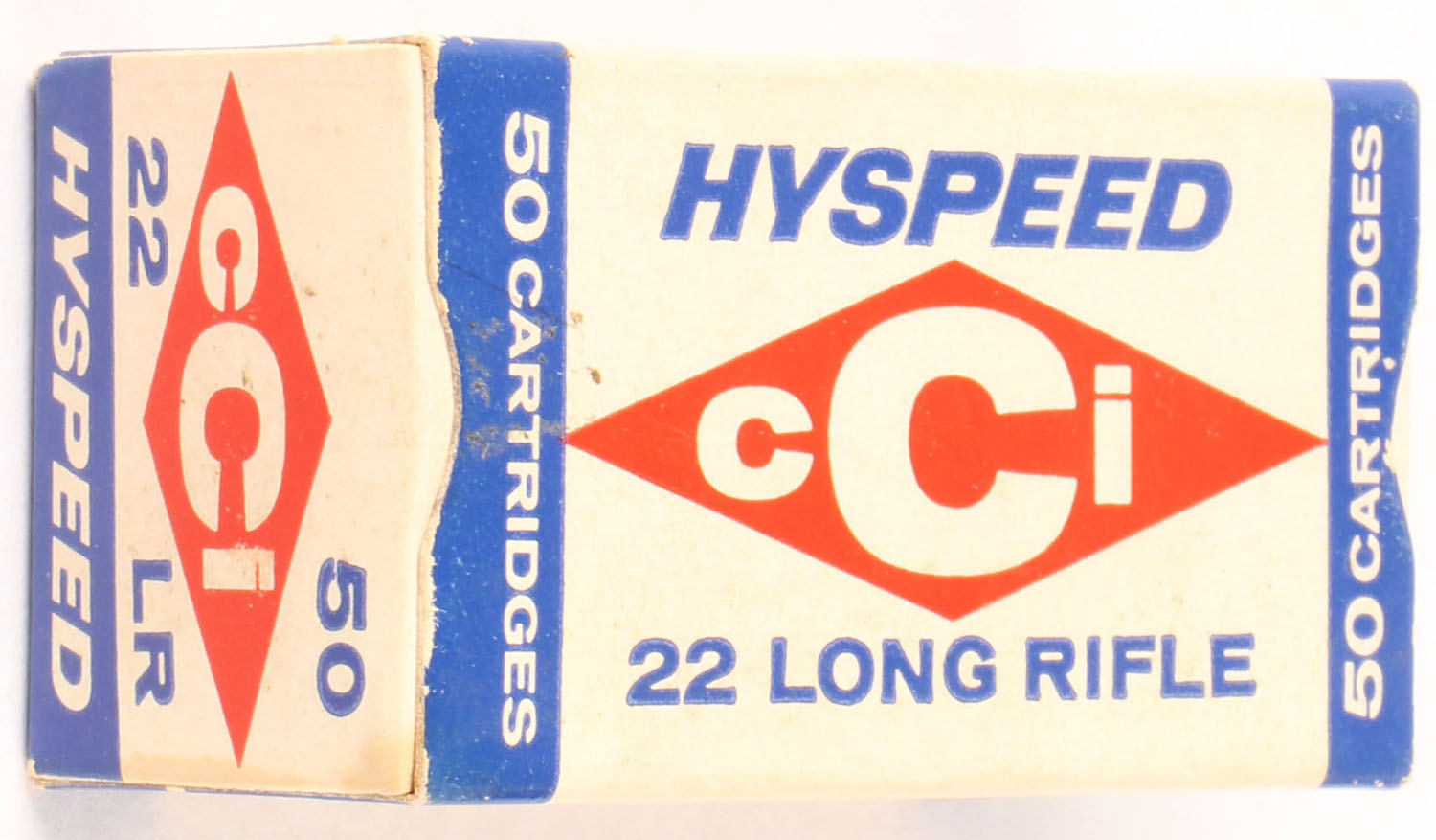 CCi, Hyspeed, .22 Long Rifle, RHWeb: CCI-1 LR-1, Full, 1pc. White red & blue box, box is near mint with minty color, only very minor corner wear, edges are crisp, end flaps are solid, ammo is minty. Grade: Excellent ++ - Value: 4 to 10