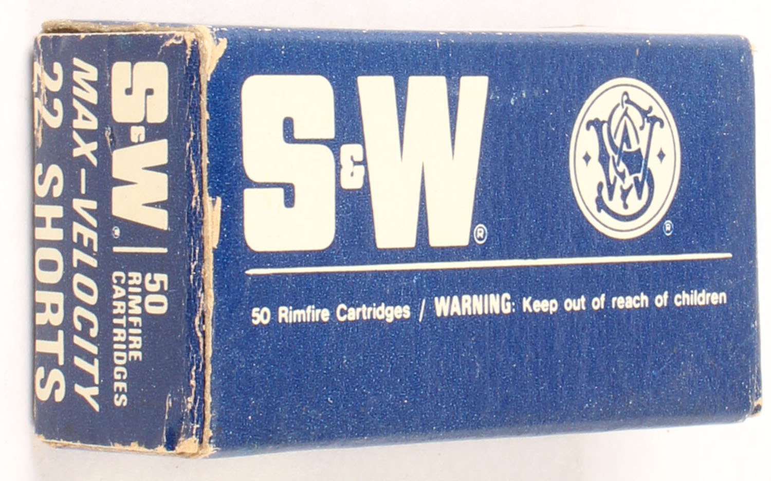 Smith & Wesson, .22 Short, Max-Velocity, RHWeb: S&W- S-3, Partial 49rds., 1pc. Blue & white box, box is near mint with minty color, only very minor corner wear, edges are crisp, end flaps are solid, ammo is minty. Grade: Excellent + - Value: 8 to 12