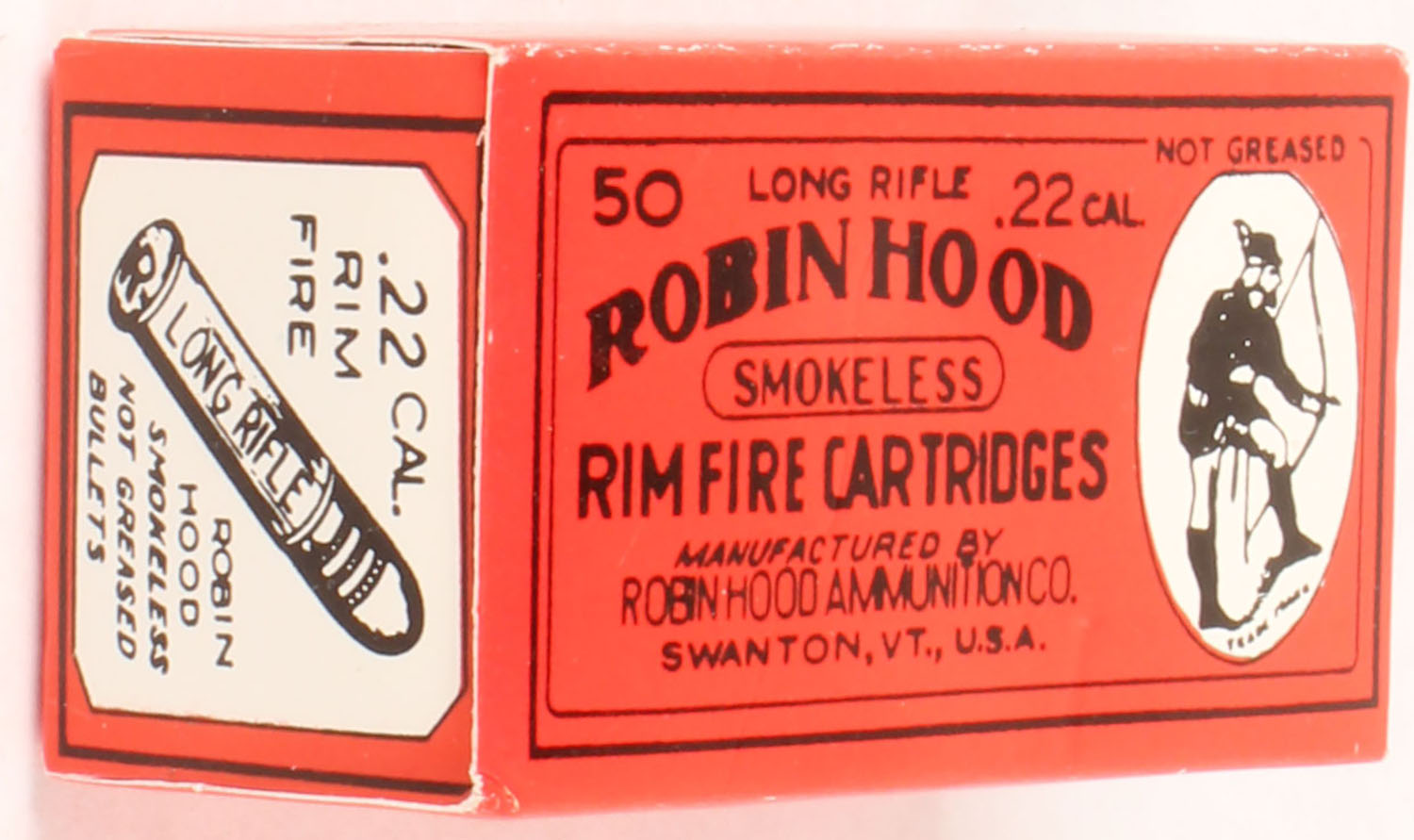 SECCA, Robin Hood Smokeless, .22 Long Rifle, RHWeb: SECCA-2 1994, Full, 1pc. Red black & white box, box is MINT with minty color, corners are sharp, edges are crisp, end flaps are solid, ammo is minty. Grade: MINT - Value: 20 to 30
