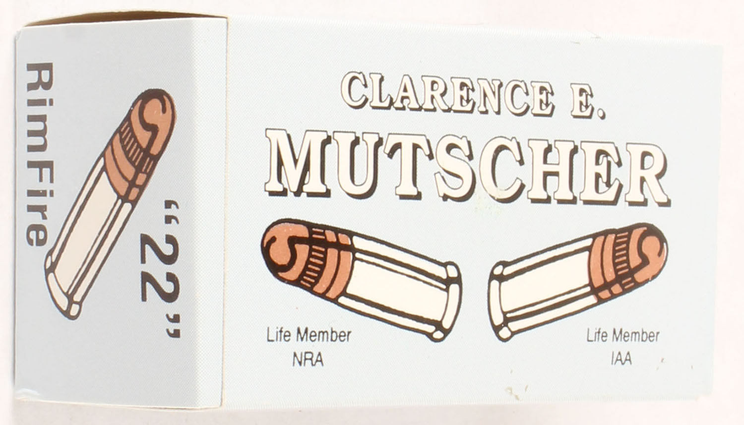 Clarence E. Mutscher, Rim Fire, .22 Long Rifle, RHWeb: MISC-2 LR-4, Full, 1pc. Blue & white box, box is MINT with minty color, corners are sharp, edges are crisp, end flaps are solid, ammo is minty. Grade: MINT - Value: 10 to 15
