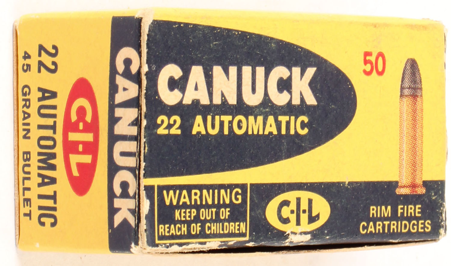C.I.L., Canuck, .22 Winchester Automatic, 45 Grain Bullet, RHWeb: CIL-6 WA-1, Full, 1pc. Yellow & blue box, box is solid with excellent color, minor edge & corner wear, top flap is solid, ammo is minty. Grade: Excellent - Value: 24 to 36