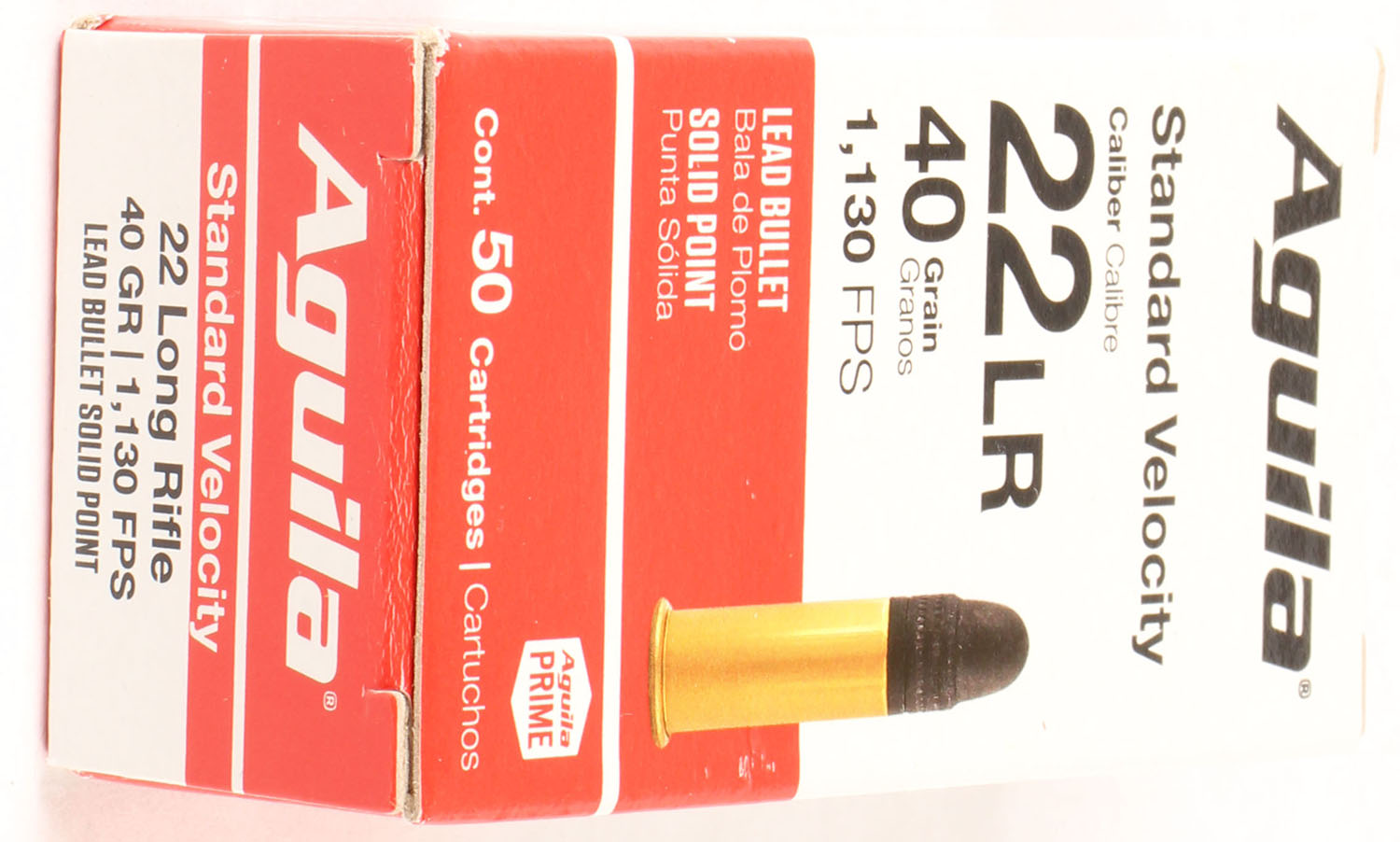 Aguila, Standard Velocity, .22 Long Rifle, 40 Grain Solid Point, 1130 FPS, Full 1pc. White & red box, box is MINT, ammo is mint. Grade: MINT - Value: 6 to 10