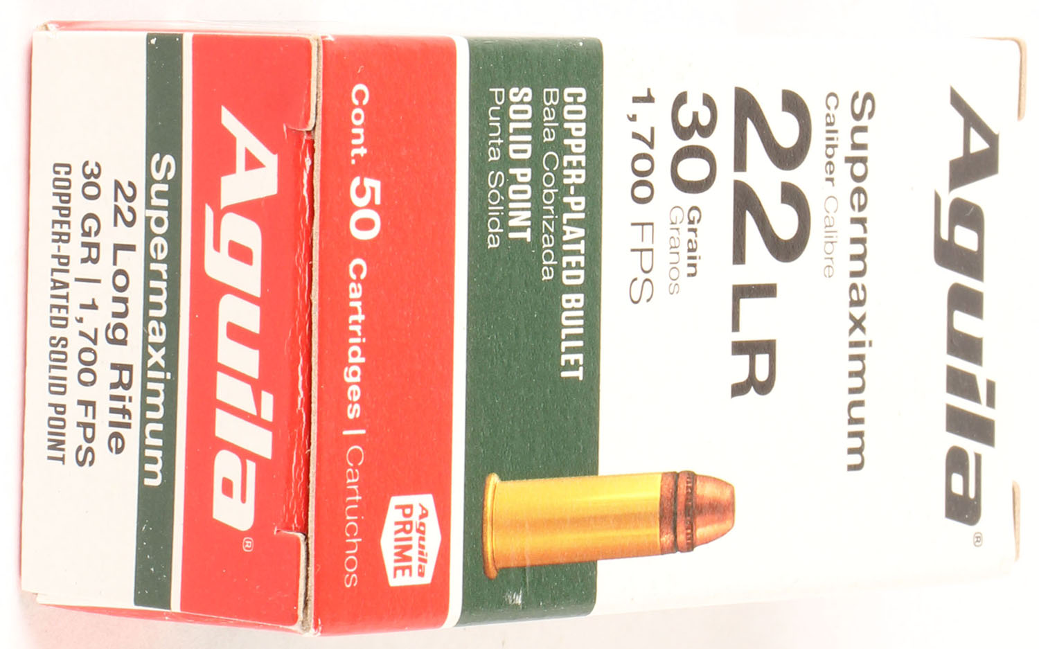 Aguila, Supermaximum, .22 Long Rifle, 30 Grain Copper Plated Bullet, 1700 FPS, Full, 1pc. Yellow red & green box, box is MINT with minty color, ammo is mint. Grade: MINT - Value: 8 to 12