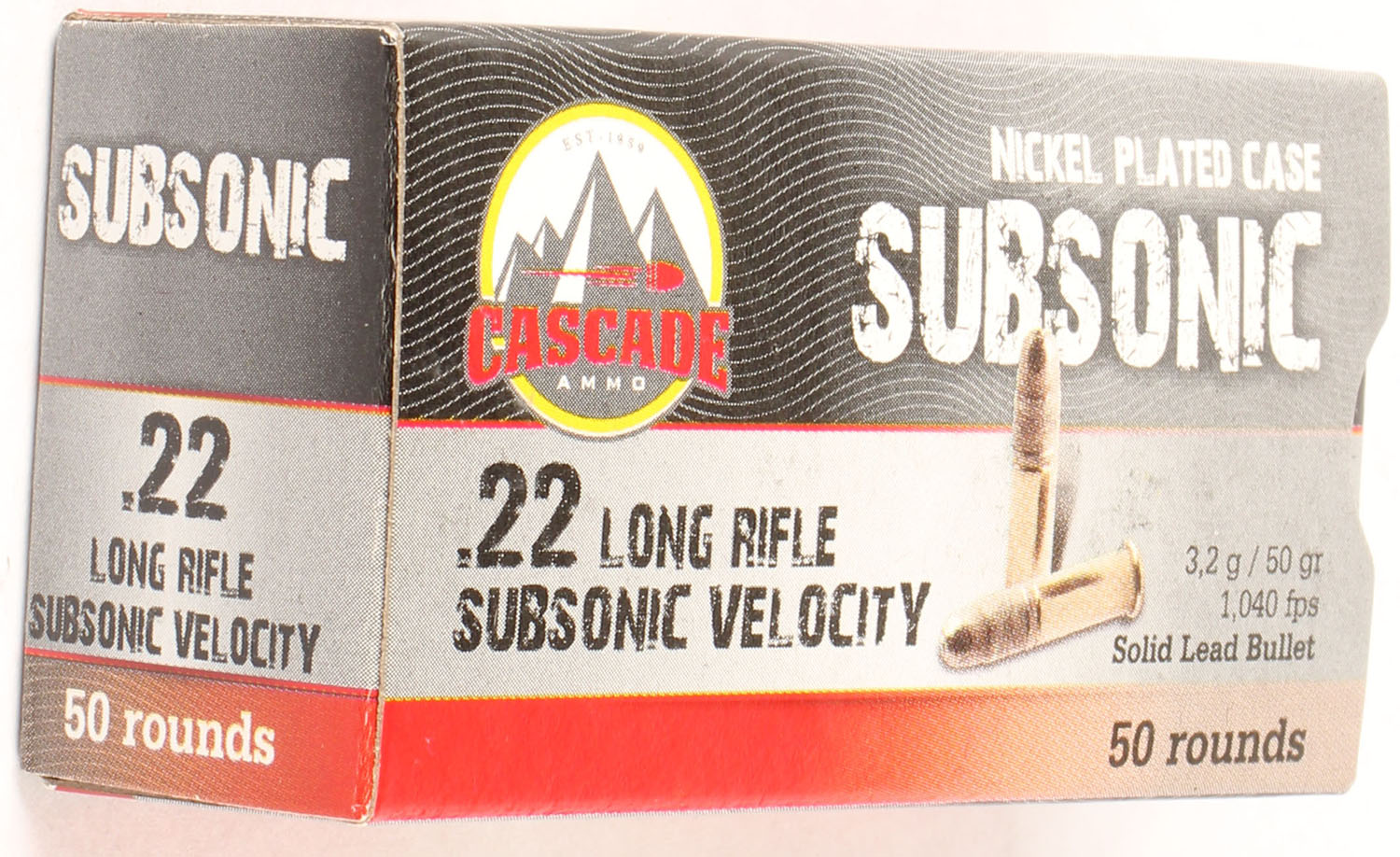 Cascade, Subsonic, .22 Long Rifle, 50 Grain Solid Lead Bullet, 1040 FPS, Full, 1pc. Gray & red box, box is MINT with minty color, ammo is mint. Grade: MINT - Value: 10 to 15