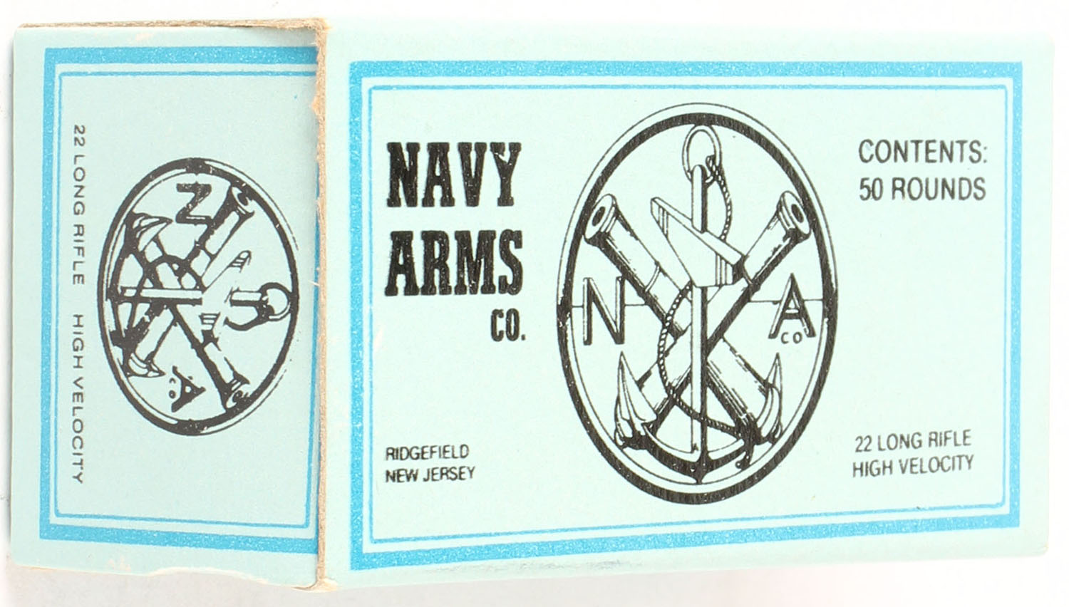 Navy Arms, .22 Long Rifle, Standard Velocity, RHWeb: NA-1 LR-4, Full, 1pc. Blue & black box, box is near mint with minty color, only very minor corner wear, edges are crisp, end flaps are solid, ammo is minty. Grade: Excellent ++ - Value: 12 to 18