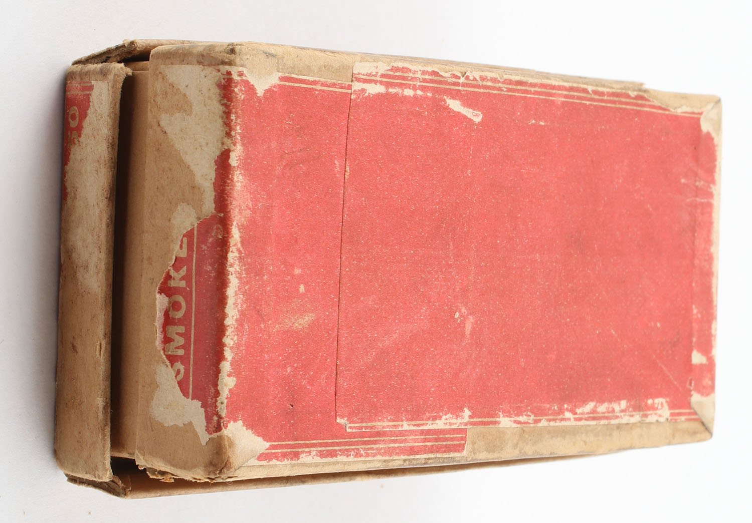 ROBIN HOOD, .32 Cal. Smith & Wesson, Solid Head Cartridges, 2pc., Partial 3rds., Central Fire, Smokeless Powder, buff box with red & white label, box has light age soiling & scuffing, box is solid on bottom & has seam splits to top, ammo is very good. Grade: Very Good + - Value: 100 to 300