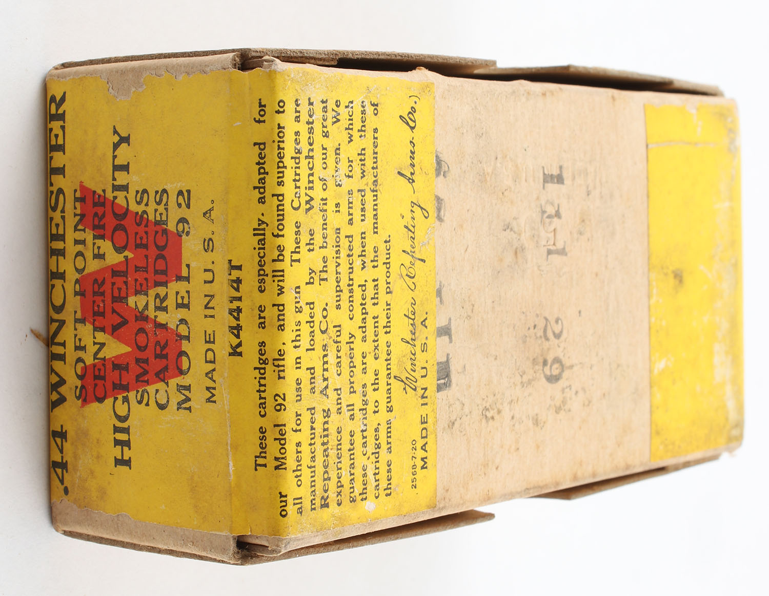 Winchester, Staynless, .44 Winchester, Smokeless, FULL & SEALED, 2pc. Buff box with yellow wraparound label, has white High Velocity over-label, box is solid with very good color, some age soiling, shelf wear, very minor edge & corner wear, labels are intact. Grade: Excellent - Value: 300 to 450
