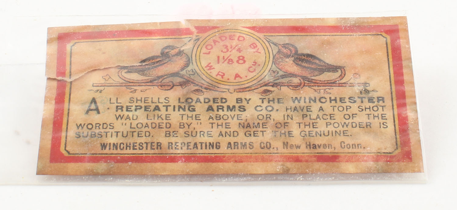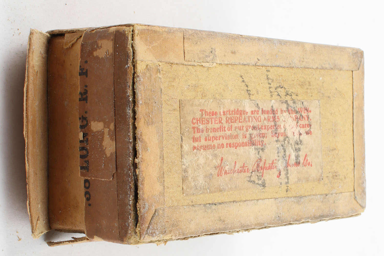 Winchester, Rifle Cartridges, .38 Long Rim Fire, FULL & SEALED, 2pc., Buff box with green top & orange side sealing label, box has seam splits to top & bottom, has age soiling with scuffing & edge wear, ammo is good. Grade: Good - Value: 40 to 120