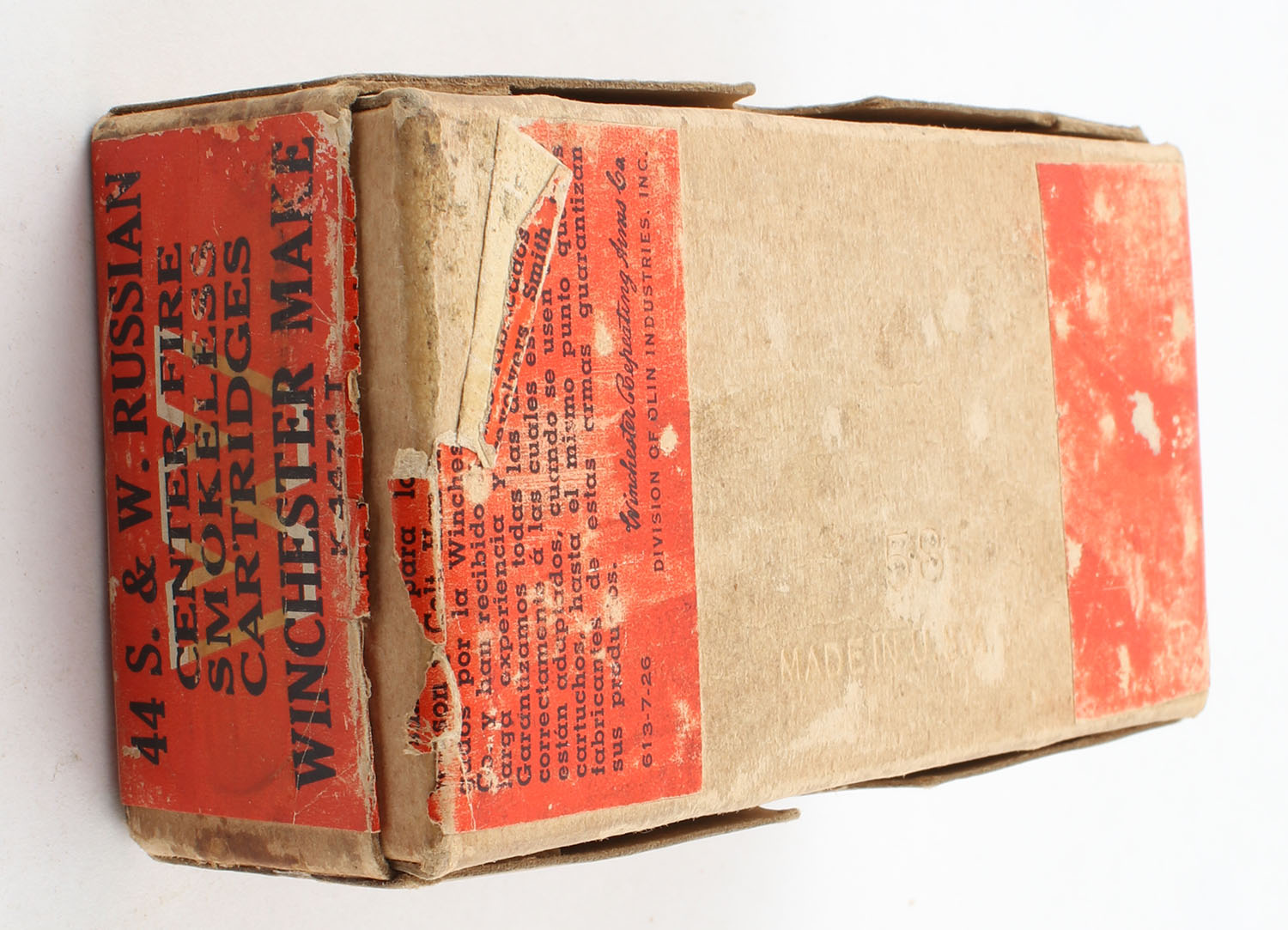 Winchester, Smokeless Cartridges, .44 Smith & Wesson Russian, 246 Grain Lead Bullets, Partial 48rds., 2pc. Buff box with red wraparound label, box is solid with very good to excellent color, shelf wear, some corner wear, edge wear, label is intact, ammo is excellent. Grade: Very Good + - Value: 50 to 100