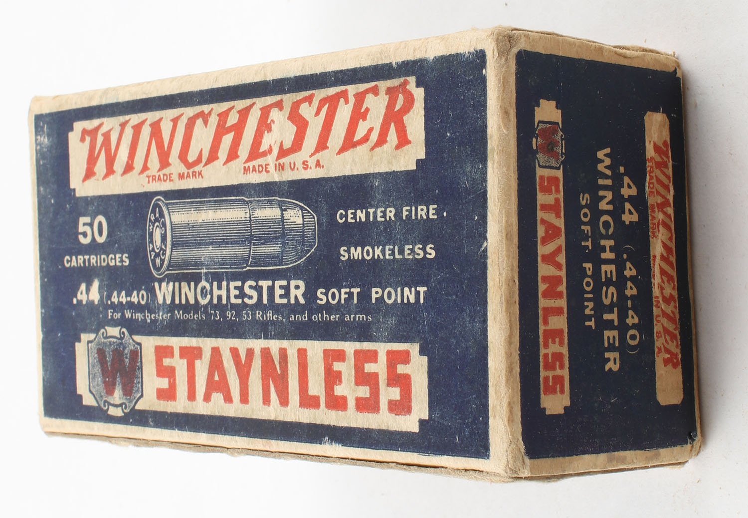 Winchester, Staynless, .44 Winchester (.44-40), Soft Point, Full, 1pc., Blue white & red box, box is solid with very good color, box has very minor age soiling, light edge & corner wear, end flaps are solid, ammo is excellent. Grade: Very Good ++ - Value: 50 to 150