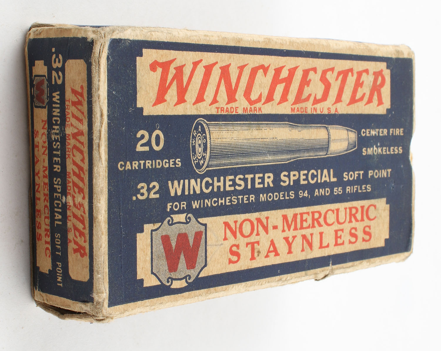 Winchester, Non-Mercuric Staynless, .32 Winchester Special, Soft Point, Partial 16rds., 1pc., Blue white & red box, box is solid with good color, has some age soiling with edge & corner wear, end flaps are solid, ammo is very good. Grade: Very Good - Value: 40 to 60