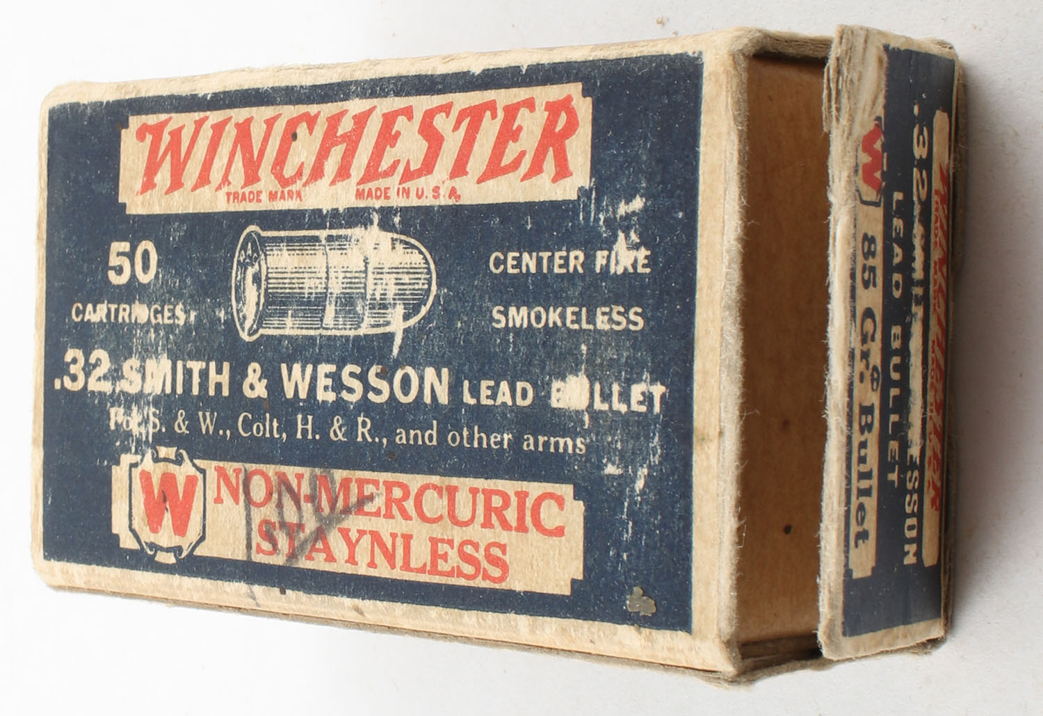 Winchester, .32 Smith & Wesson, Non-Mercuric, Staynless, Oil Proof, Full of mixed ammo, 85 Grain Lead Bullet, 1pc., Blue white & red box, box is solid with very good color, has rub marks with light edge & corner wear, right end flap is torn, left end flap has tape repair on inside, ammo is very good. Grade: Good + - Value: 20 to 60