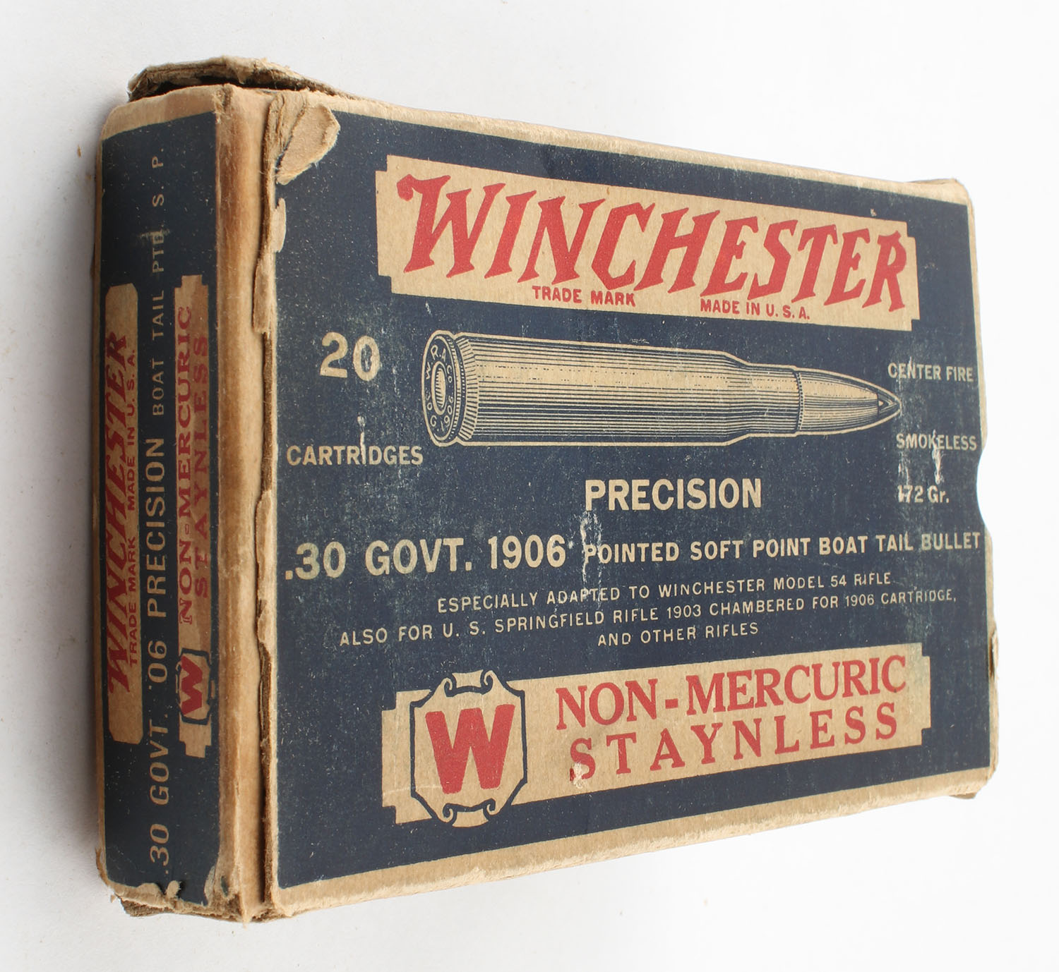 Winchester, Non-Mercuric Staynless, .30 Govt. 1906, 172 Gr. Pointed Soft Point Boat Tail Bullet, Full, 1pc., Blue white & red box, box has light age soiling, corner & edge wear, right end flap is torn, left end flap is solid, ammo is very good. Grade: Good ++ - Value: 20 to 80