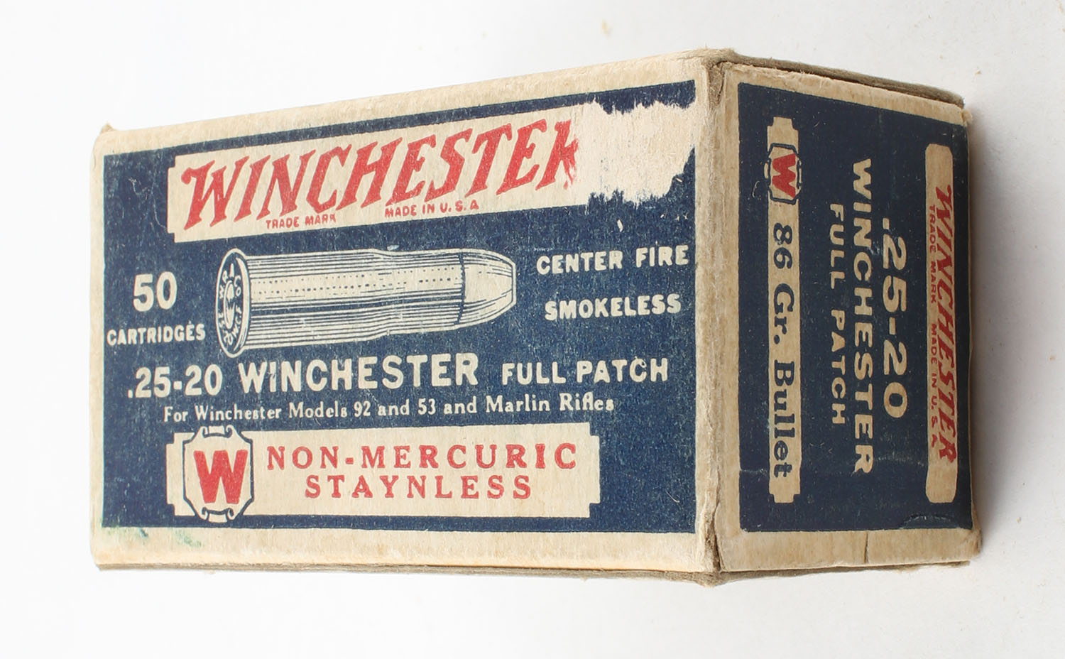 Winchester, Non-Mercuric Staynless, .25-20 Winchester, Full, 1pc., 86 Grain Full Patch, Blue white & red box, box is solid with great color, has corner & edge wear, end flaps are solid, ammo is excellent. Grade: Very Good + - Value: 50 to 150