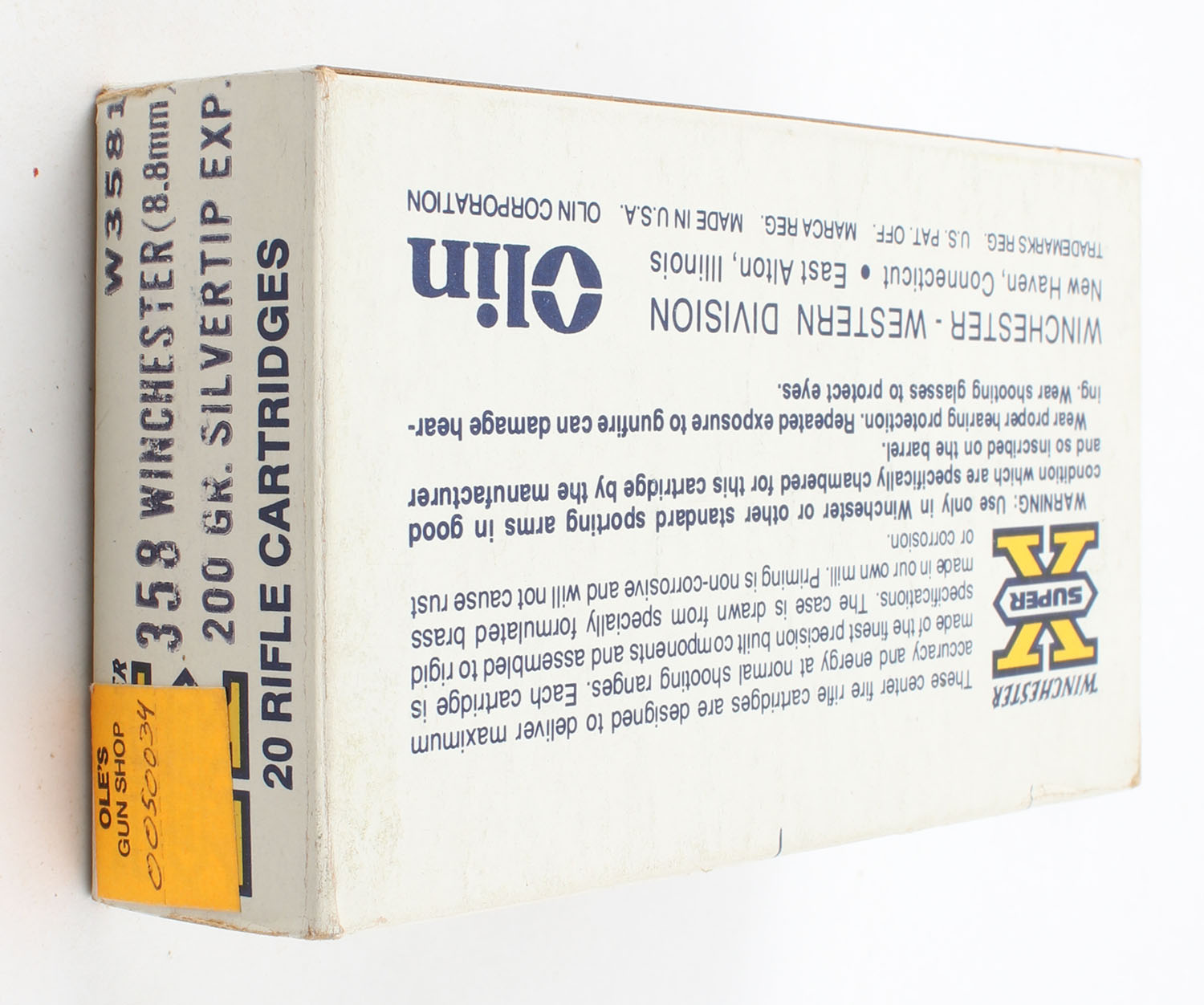 Winchester, Super X, .358 Winchester (8.8mm), 200 Grain Silvertip Expanding, Full, 1pc. White black & yellow box, box is solid with very good to excellent color, has light scuffing with sticker to right flap, end flaps are solid, ammo is very good. Grade: Very Good ++ - Value: 50 to 75