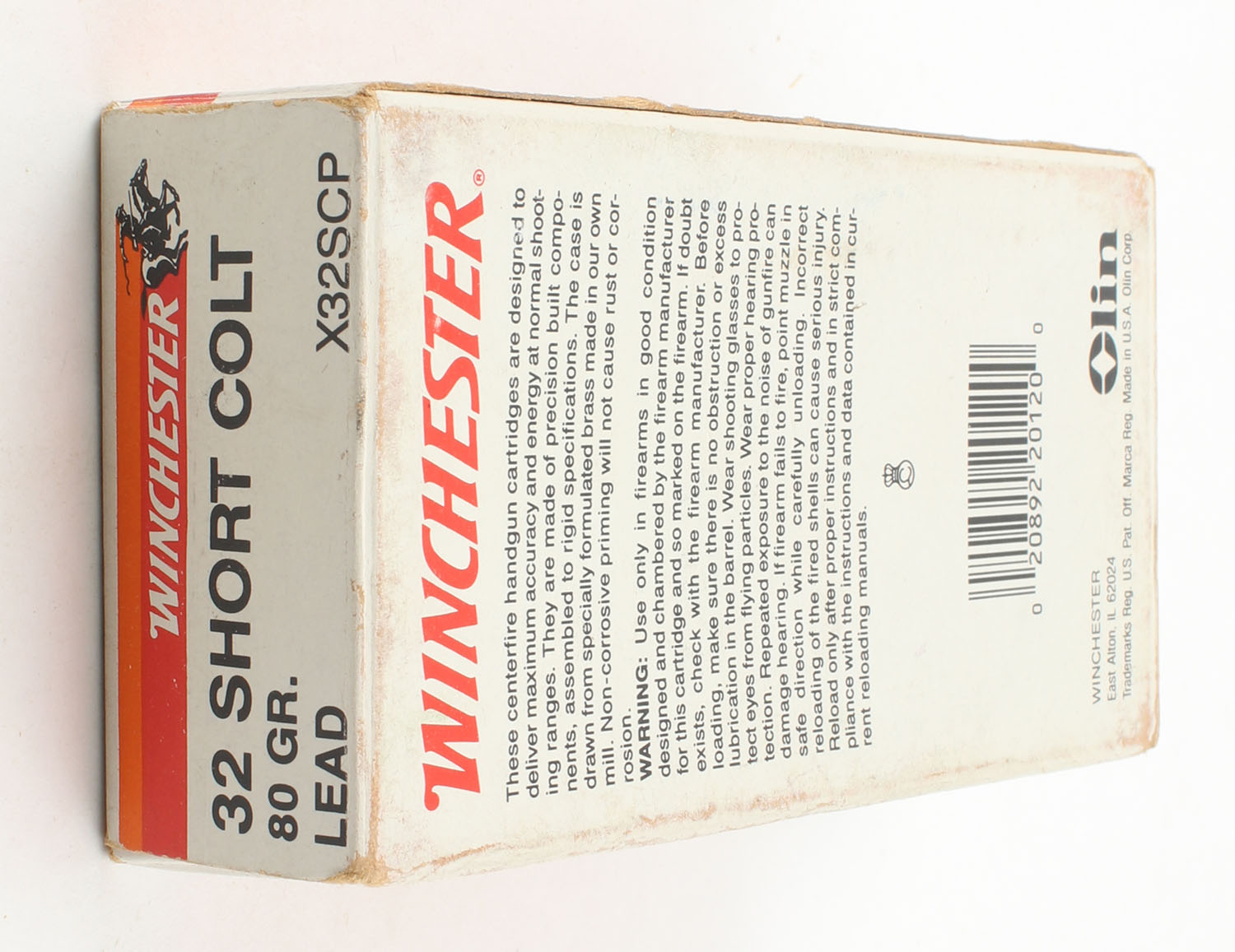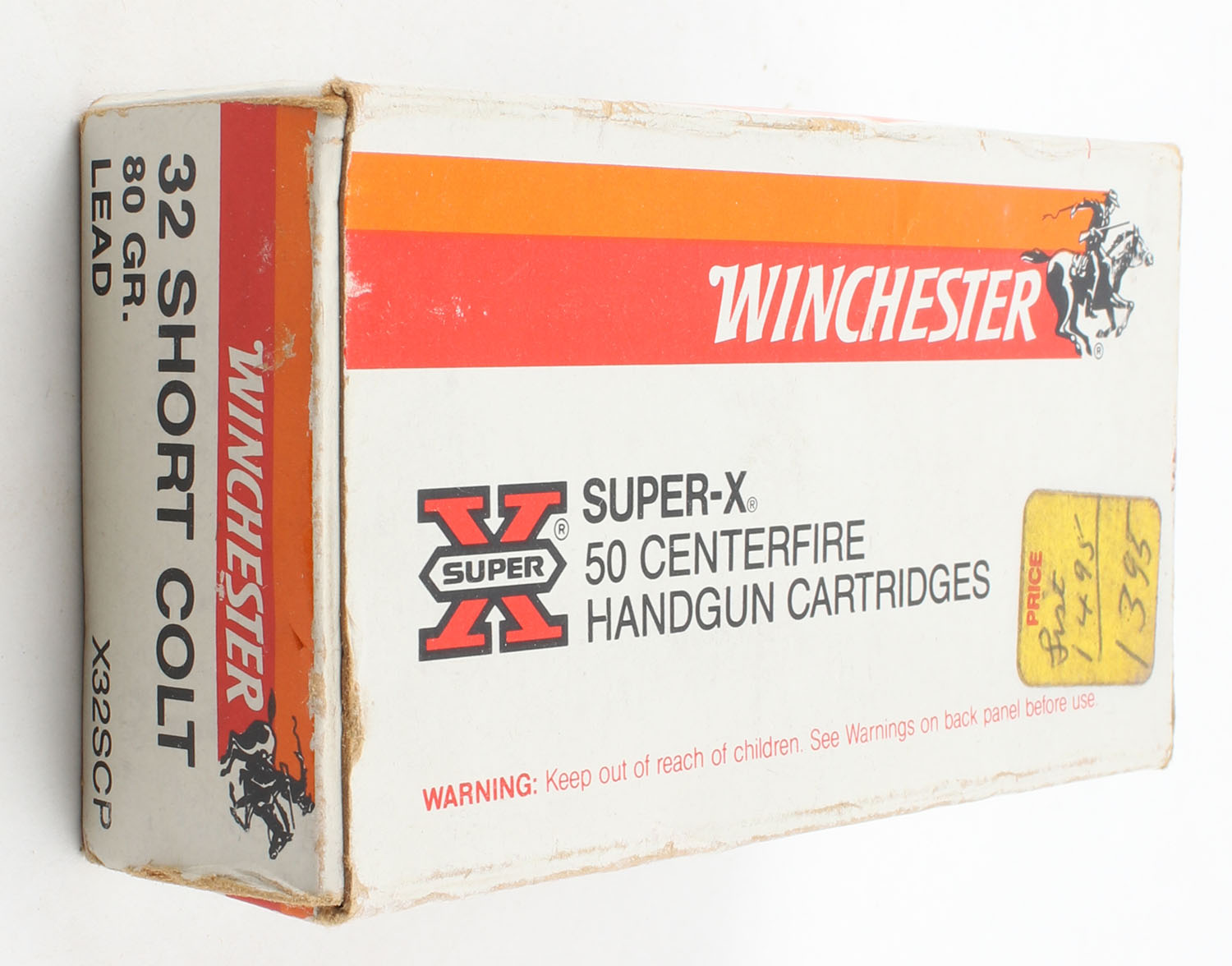Winchester, Super-X, .32 Short Colt, 80 Gr. Lead, Partial 42rds., 1pc. White red & orange box, box is solid with good color, has light age soiling with edge & corner wear, has sticker to front, end flaps are solid, ammo is very good. Grade: Very Good - Value: 30 to 60