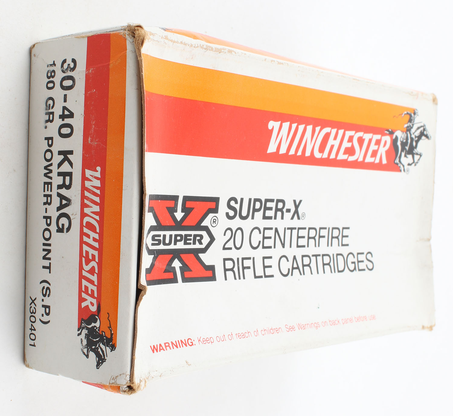 Winchester, Super-X, .30-40 Krag, 180 Grain Power Point (S.P), Full, 1pc., Gray red & orange box, box has scuffing with corner wear, has rub marks, end flaps are solid, ammo is excellent. Grade: Very Good - Value: 20 to 50