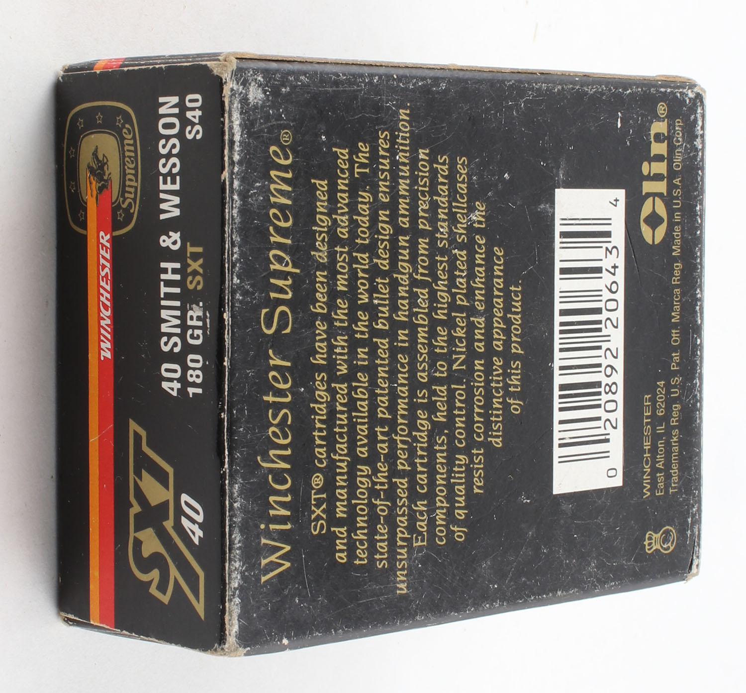 Winchester, Supreme, .40 Smith & Wesson, 180 Grain SXT, Full, 1pc., Black box, box has light age soiling, edge & corner wear, end flaps are solid, ammo is excellent. Grade: Very Good ++ - Value: 40 to 100