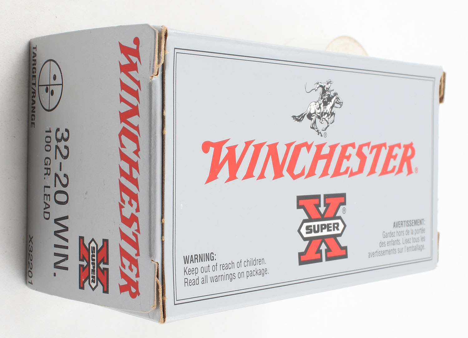 Winchester, Super-X, .32-20 Winchester, 100 Grain Lead, Full, 1pc., Silver & red box, box is very solid with excellent color, end flaps are solid, ammo is excellent. Grade: Excellent ++ - Value: 60 to 90