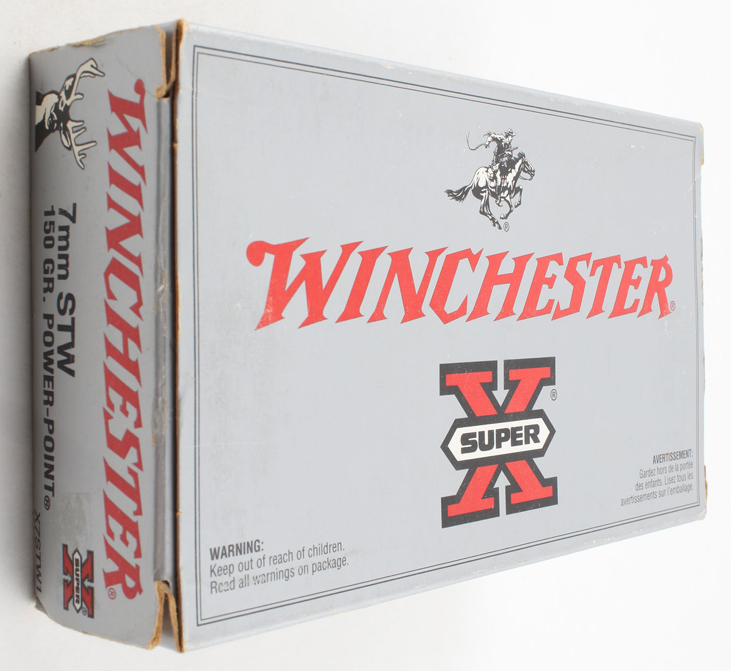 Winchester, Super-X, 7mm STW, 150 Grain Power Point, Full, 1pc., Silver & red box, box is solid with very good color, has light scuffing, some corner wear, end flaps are solid, ammo is excellent. Grade: Excellent - Value: 50 to 75
