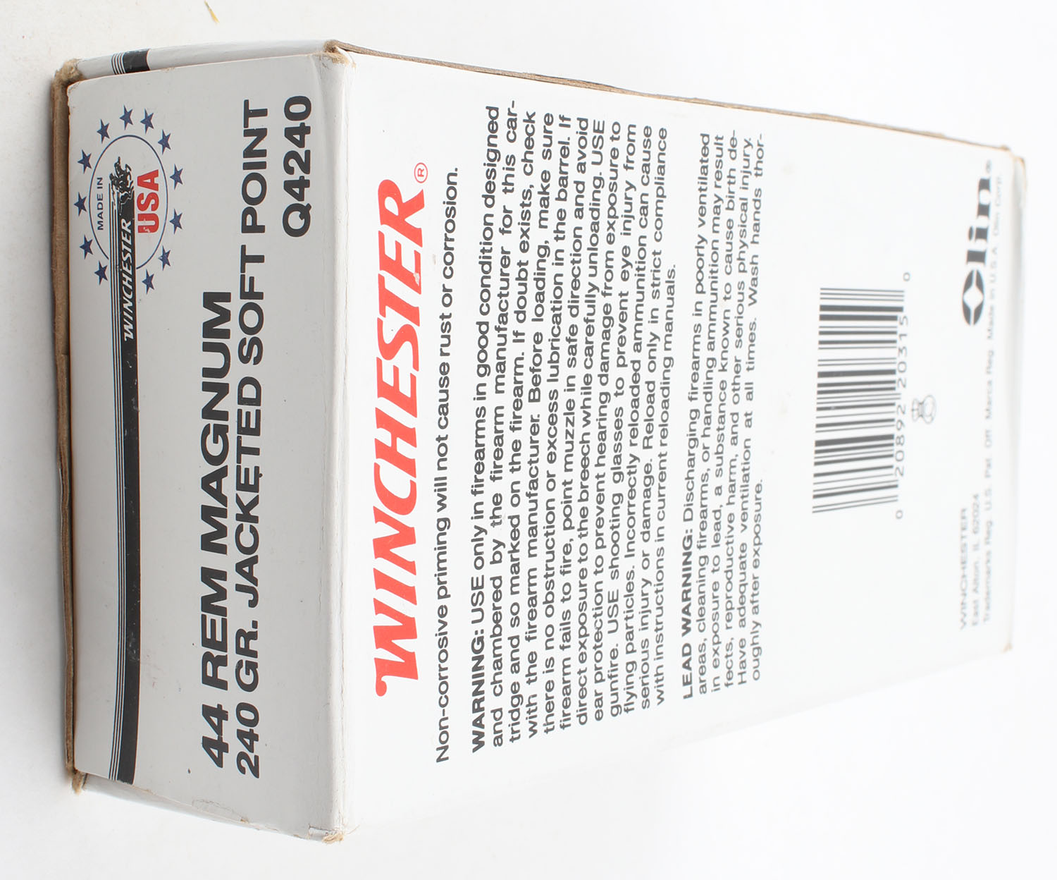 Winchester, USA, .44 Remington Magnum, 240 Grain Jacketed Soft Point, Appears Full, 1pc. White red & black box, box has scuffing with rub marks, end flaps are solid, ammo is excellent. Grade: Very Good - Value: 20 to 60