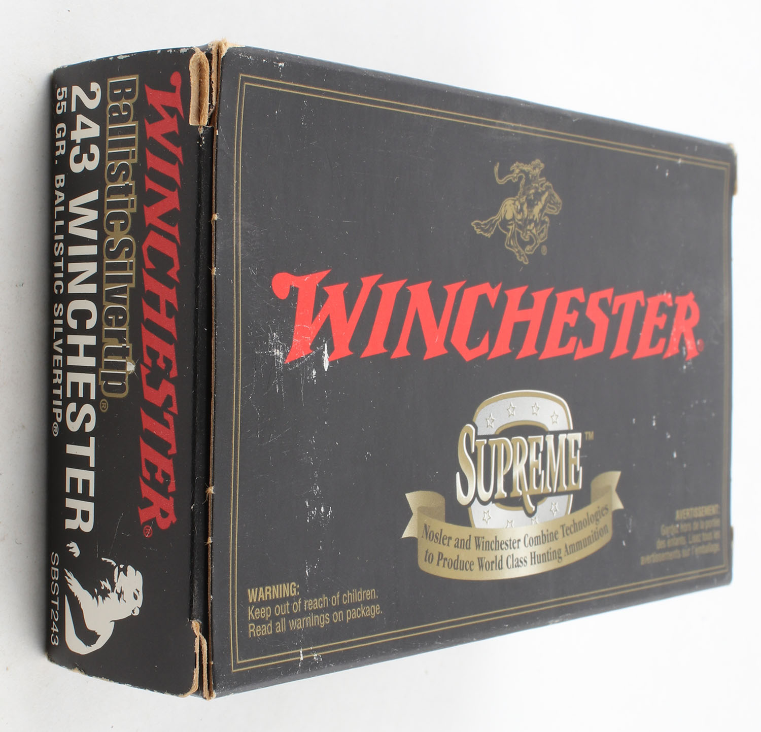 Winchester, Supreme, .243 Winchester, 55 Gr. Ballistic Silvertip, Full, 1pc. Black red & gold box, box is very solid with excellent color, box has light scuffing, end flaps are solid, ammo is minty. Grade: Excellent - Value: 20 to 60