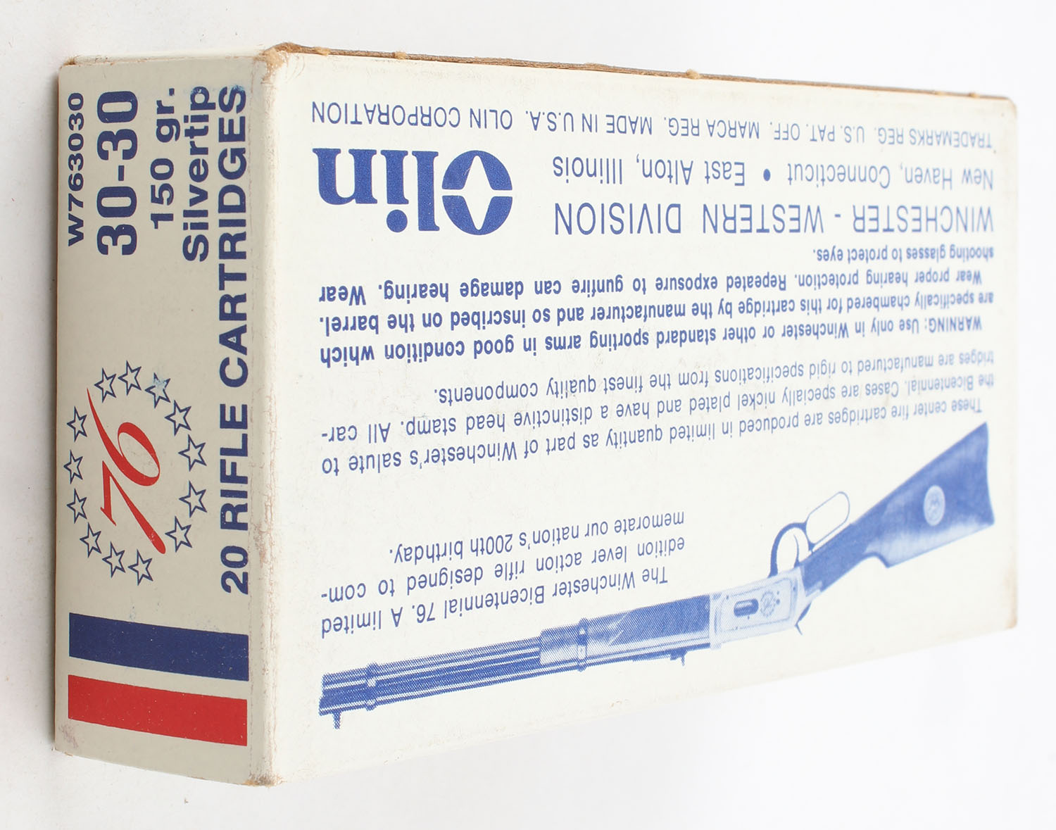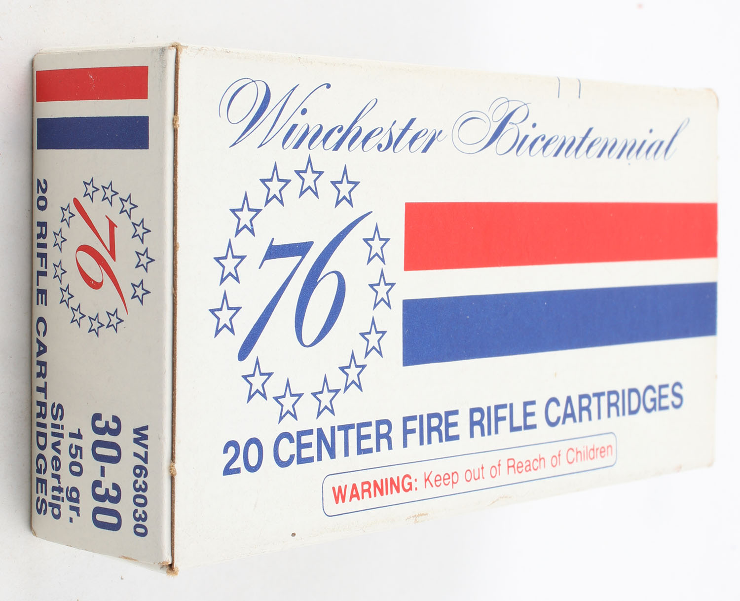 Winchester, Bicentennial, .30-30 Winchester, 150 Gr. Silvertip, Full, 1pc. White blue & red box, box is very solid with excellent color, end flaps are solid, ammo is minty. Grade: Excellent ++ - Value: 20 to 60